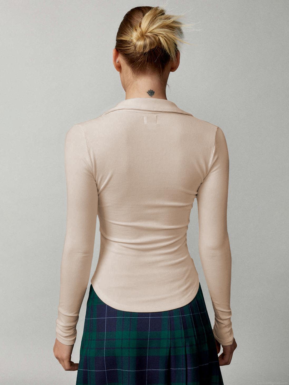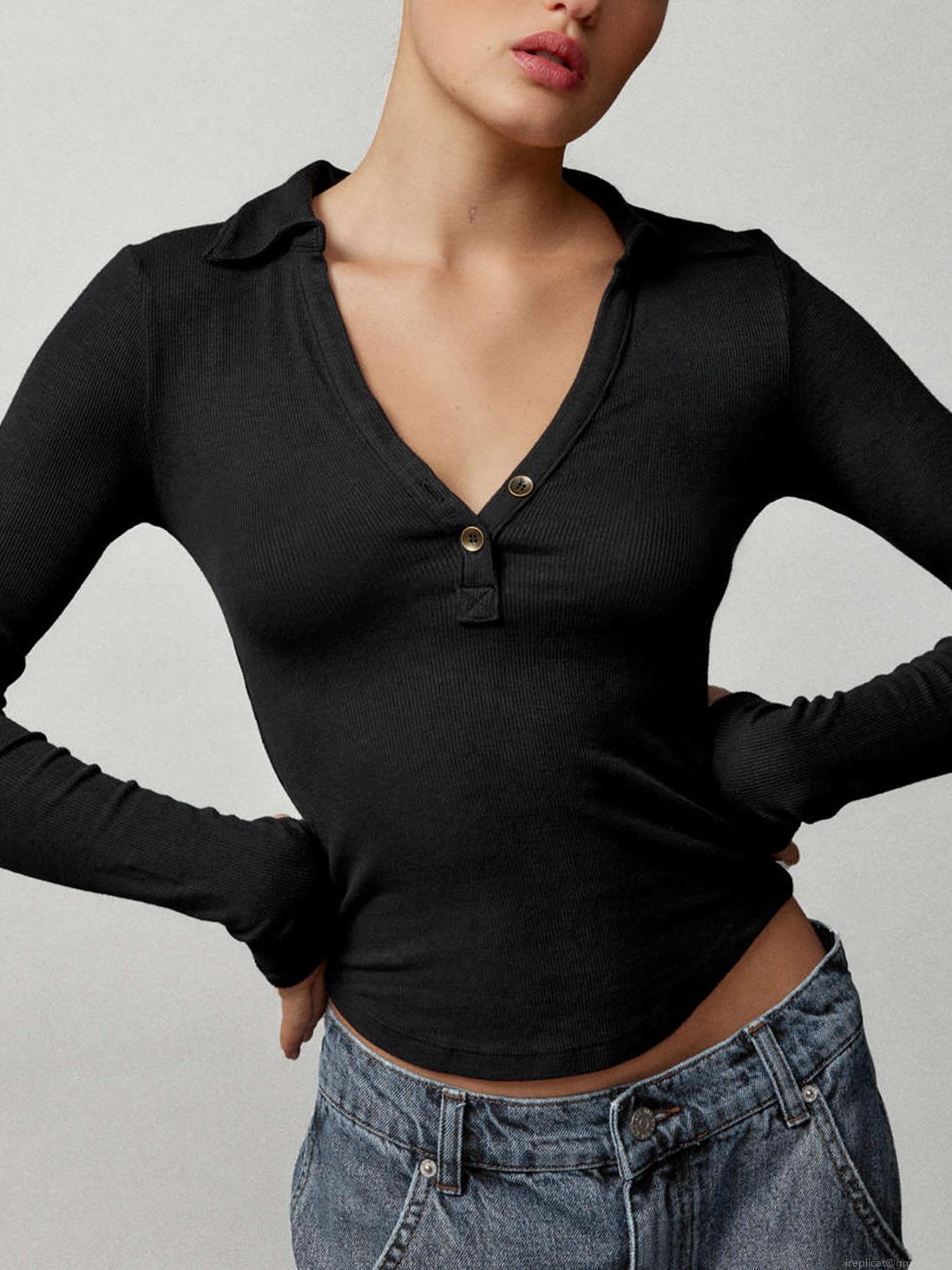 • Elegant Ribbed Polo Neck Long Sleeve T-Shirt For Women Slim Fit V-Neck Button Down Knit Top For Daily Casual Commuter Autumn