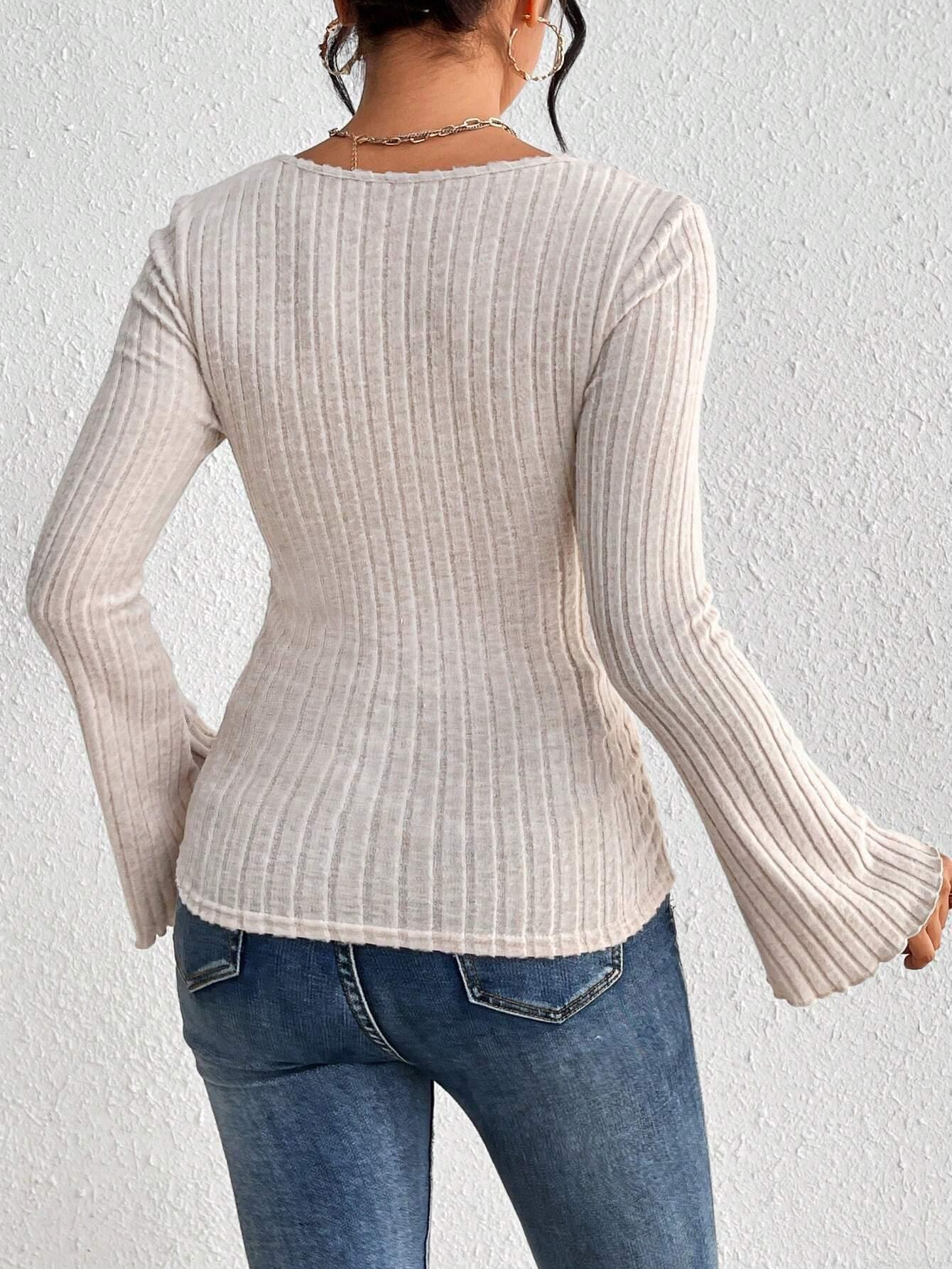 Solid Color, Ribbed Knit, Knot Design, Bell Sleeves, Heart-shaped Neckline