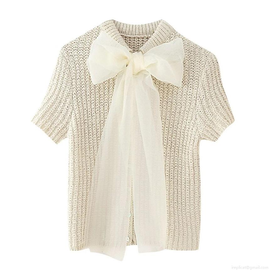 Elegant Women's Knit Short Sleeve Top with Large Organza Bow Sweet French Style Slim Pullover T-Shirt for Women Casual Dating Cream Beige