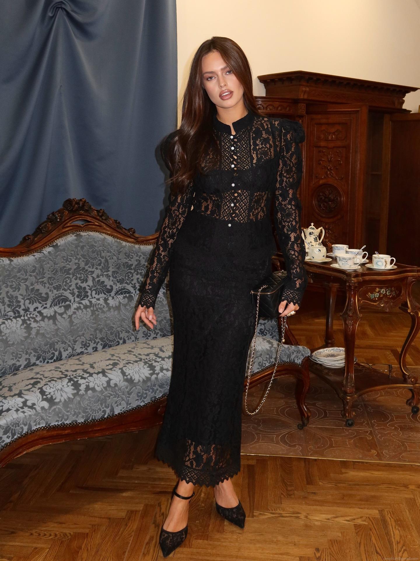 • Elegant Women's Lace Top Vintage Stand Collar Long Sleeve Hollow Out Shirt With Pearl Buttons Slim Fit Cotton Lace T-Shirt For Spring Autumn