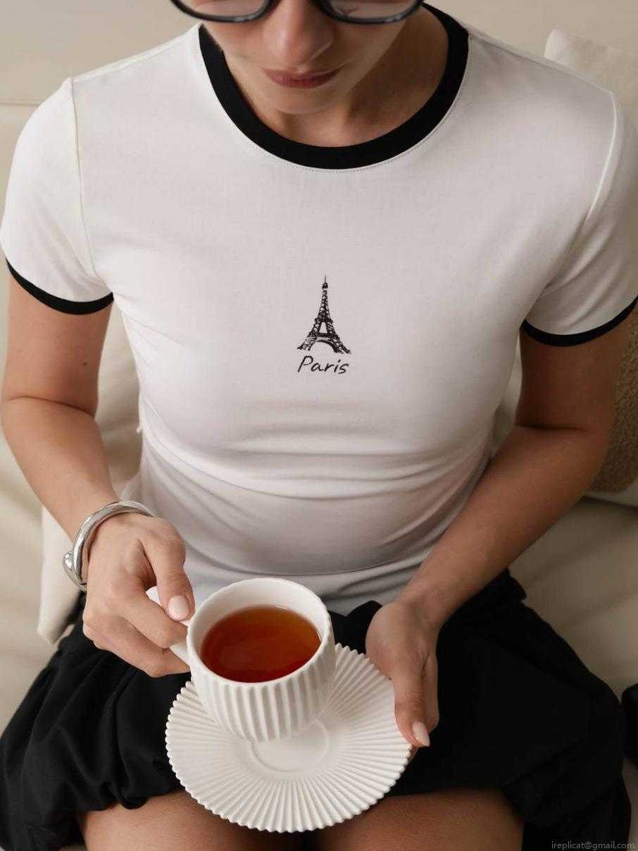 • French Retro Women Paris Eiffel Tower Graphic T-Shirt Cotton Round Neck Contrast Binding Short Sleeve Slim Fit Casual Summer Crop Top