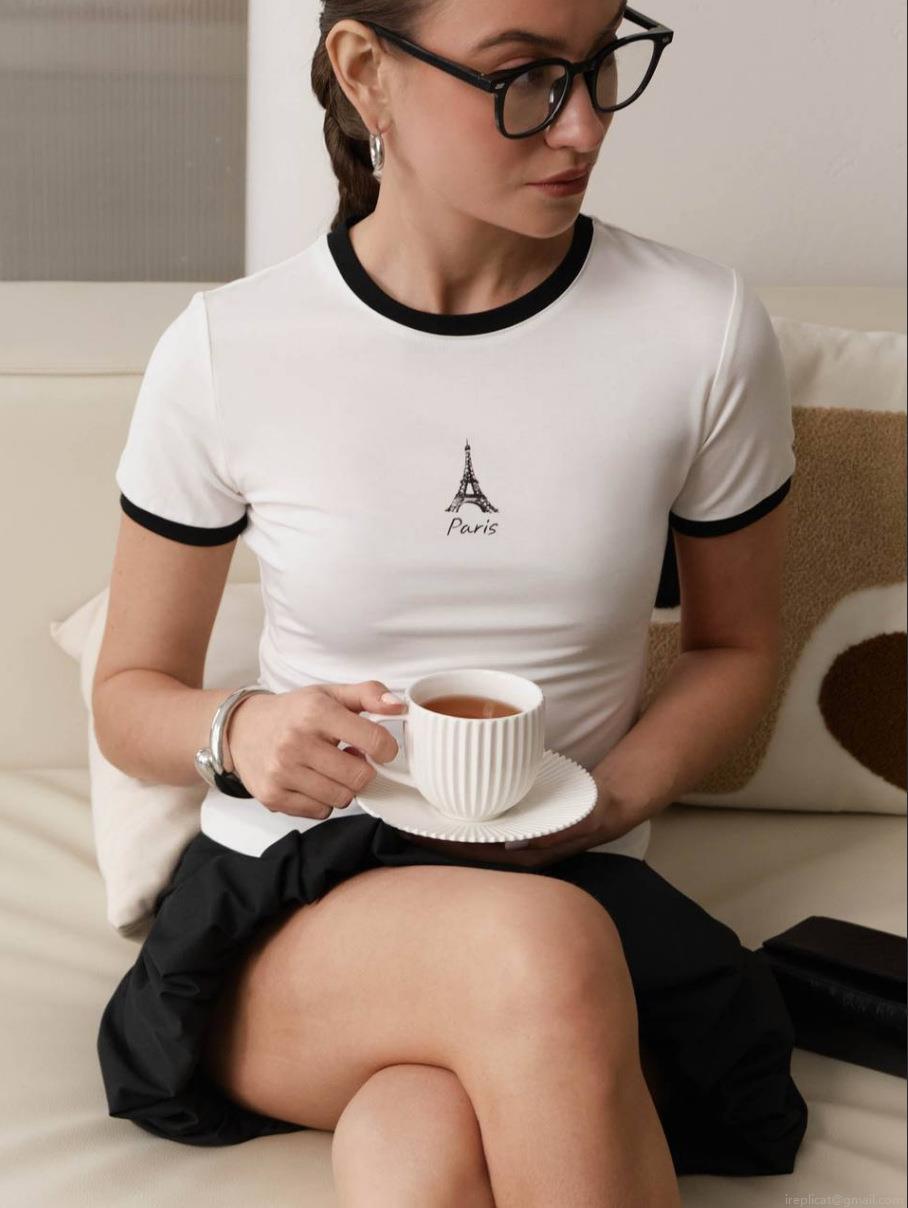 French Retro Women Paris Eiffel Tower Graphic T-Shirt Cotton Round Neck Contrast Binding Short Sleeve Slim Fit Casual Summer Crop Top