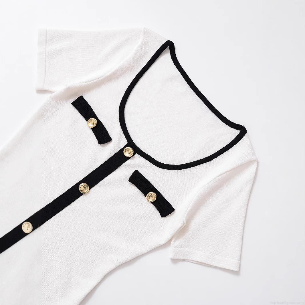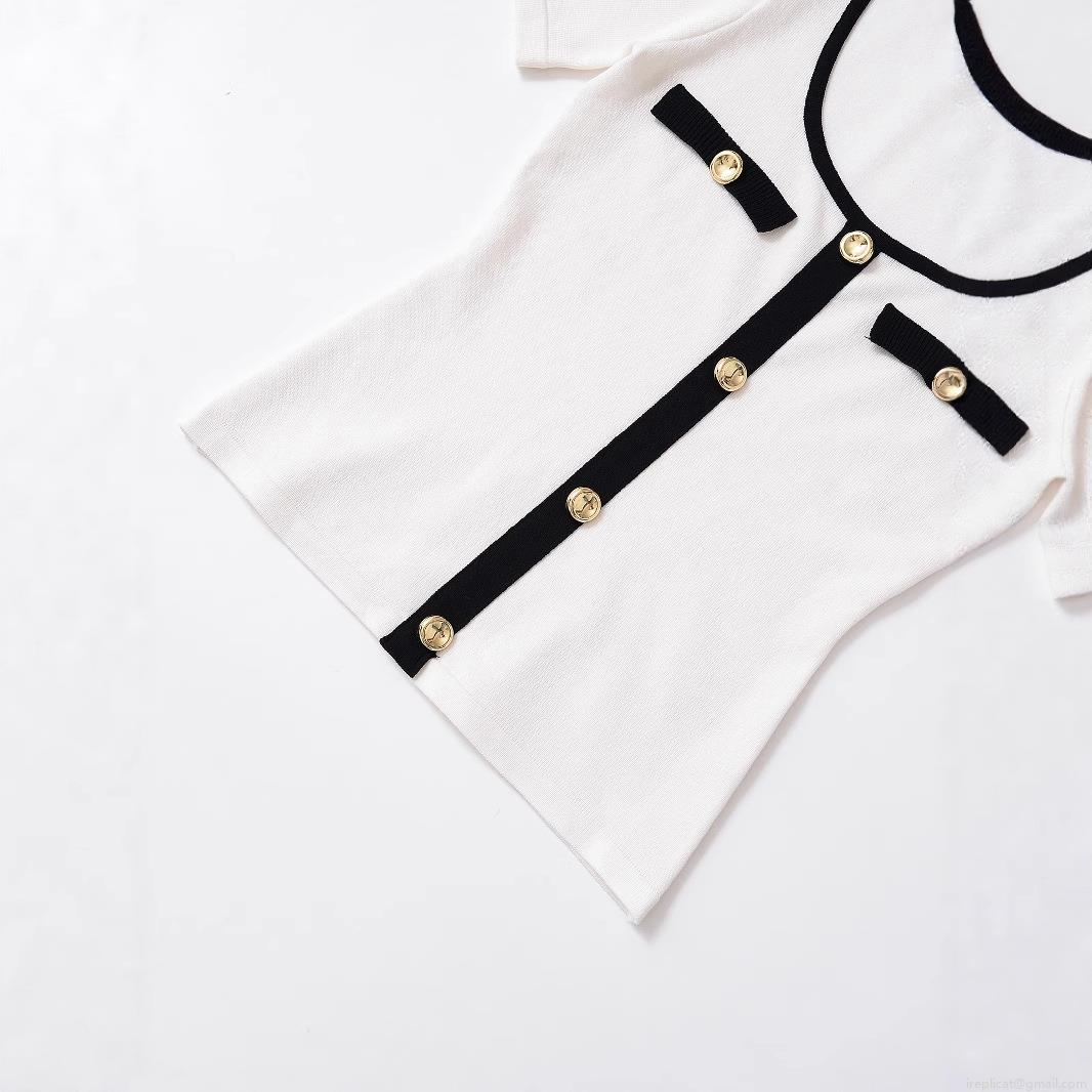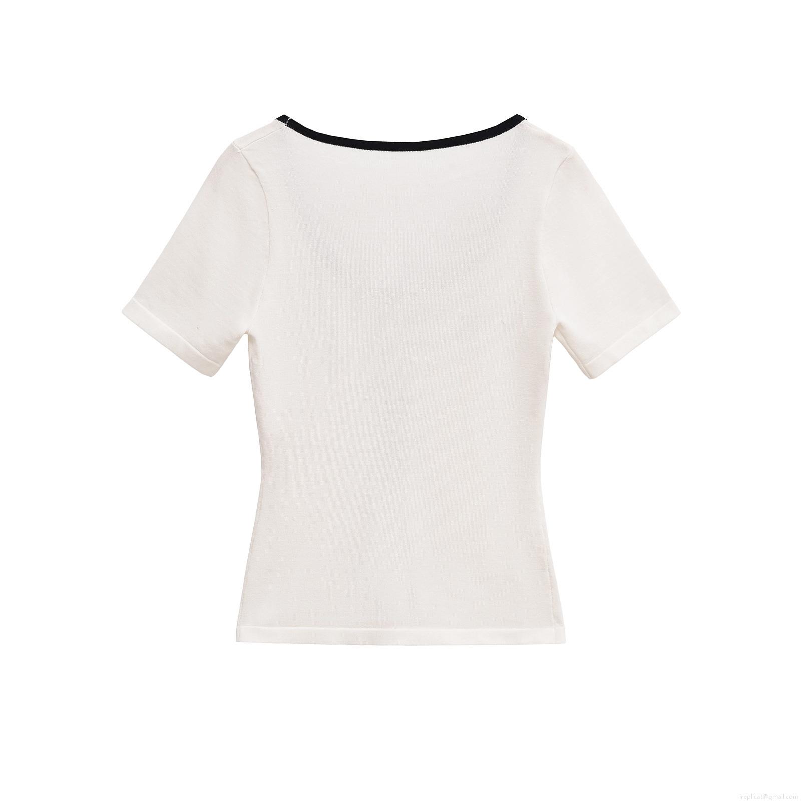 French Style Contrast Trim Knit T-Shirt Elegant Mercerized Cotton Short Sleeve Top With Gold Buttons Slim Fit Casual Round Neck Women Clothing