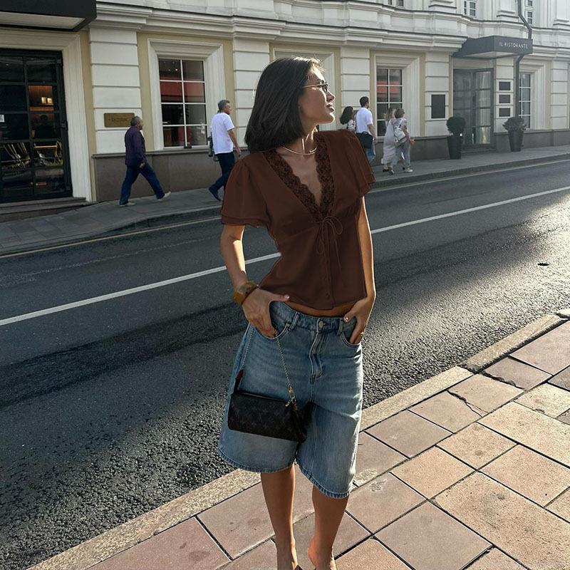 • French Style Lace Patchwork Satin T-Shirt For Women Summer Slim Fit V-Neck Lace-Up Short Sleeve Crop Top Sexy Elegant Ladies Solid Color Tee