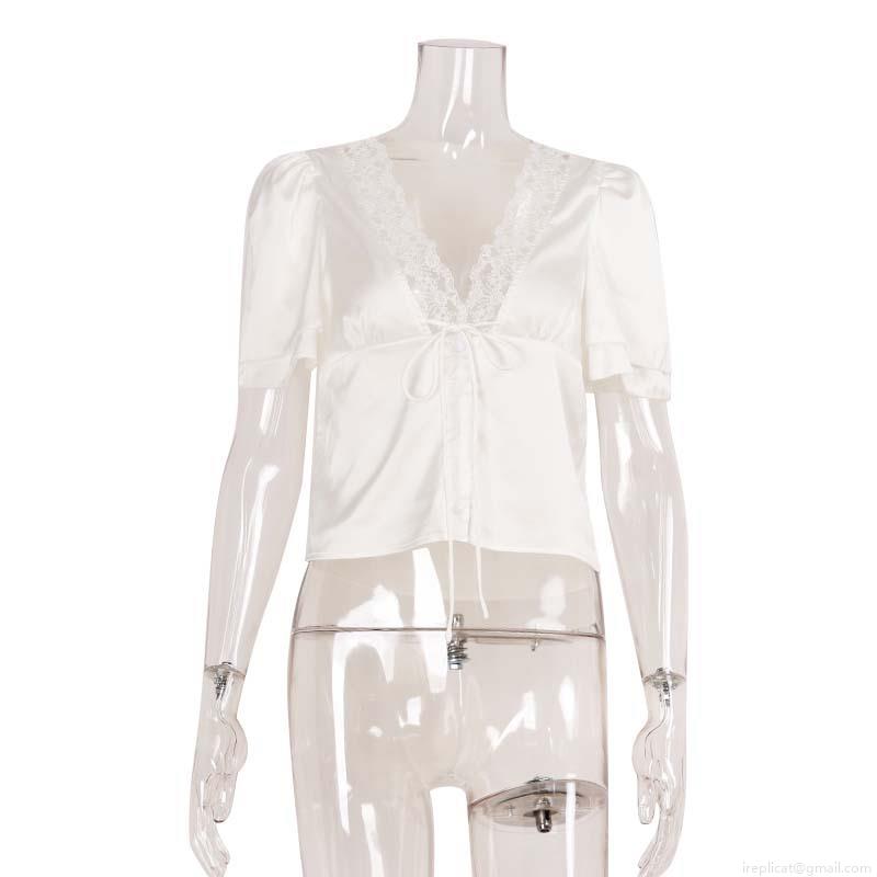 French Style Lace Patchwork Satin T-Shirt For Women Summer Slim Fit V-Neck Lace-Up Short Sleeve Crop Top Sexy Elegant Ladies Solid Color Tee