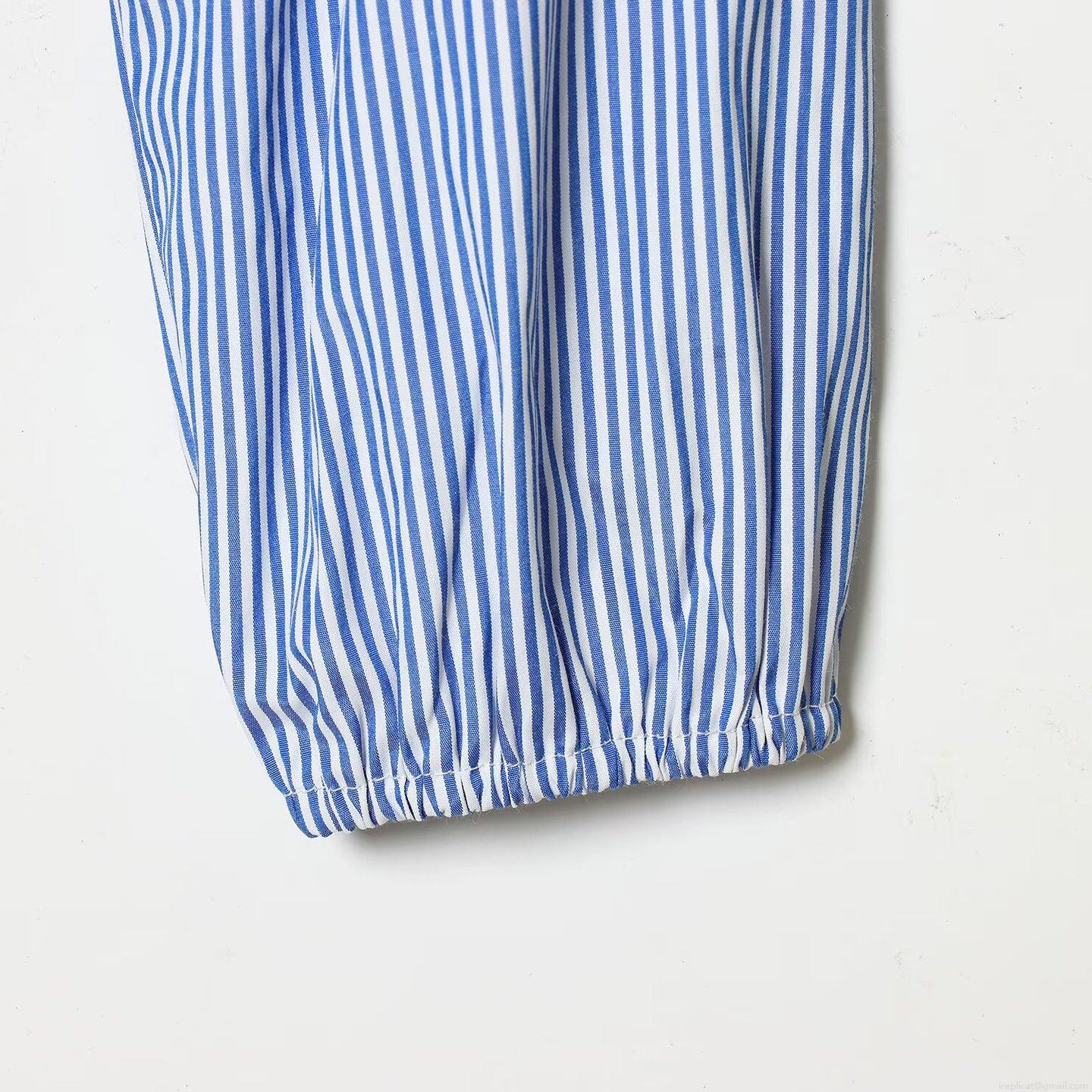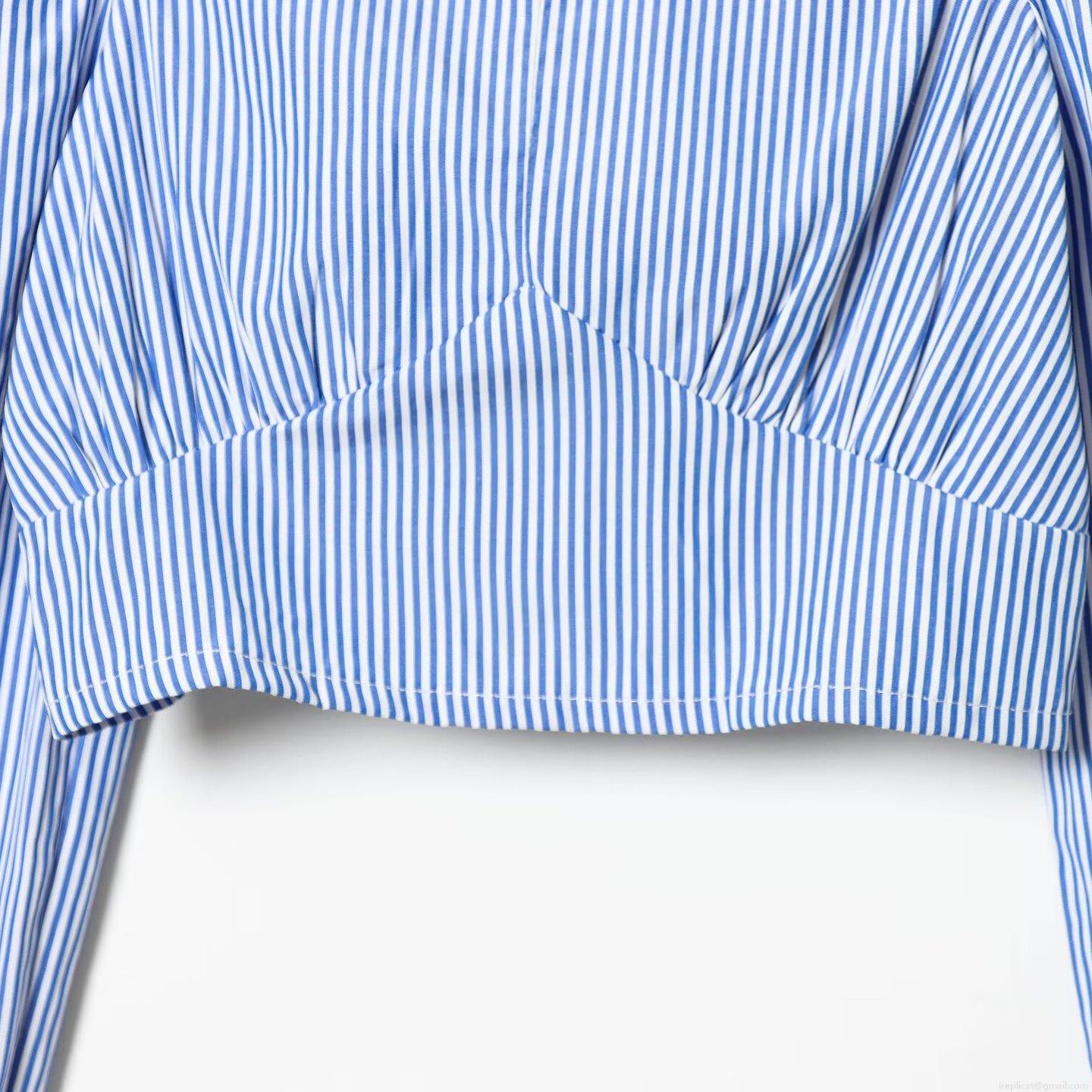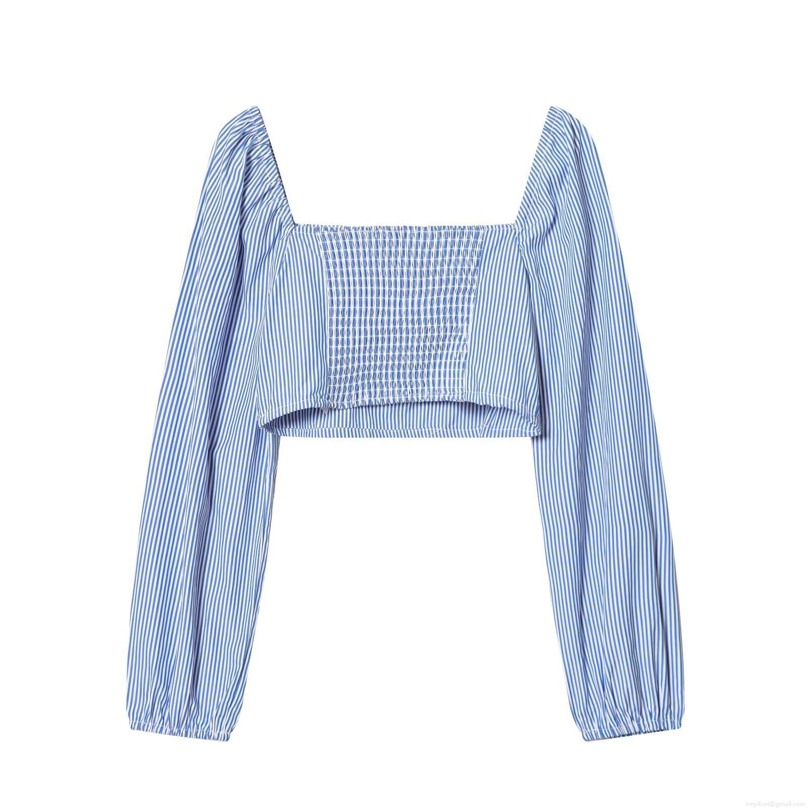 • French Style Women Blue White Striped Square Neck Cropped Top Long Puff Sleeve Smocked Slim Fit Blouse T-Shirt For Casual Vacation