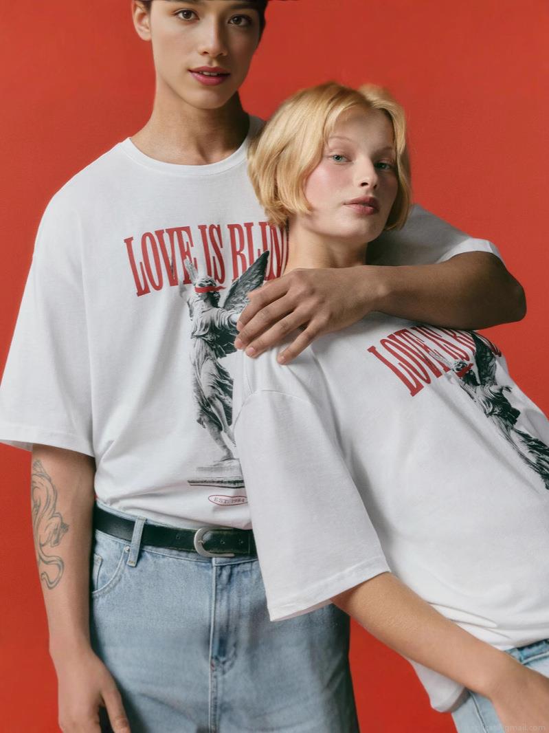 • Graphic T-Shirt Women Men Cotton Blend Streetwear Love Is Blind Print Loose Casual Short Sleeve Retro Angel Tee Couple Tops Unisex Fashion Clothing