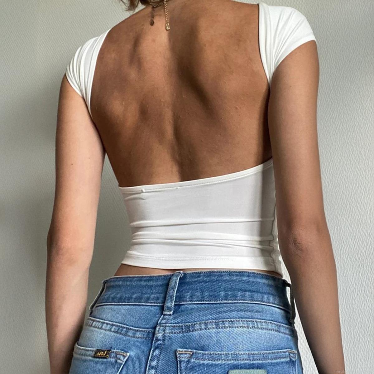 • Sexy Backless Short Sleeve T-Shirt Viscose Elastane Knitted Hollow Out Boat Neck Fly Sleeve Slim Fit Solid Color Crop Top for Women Summer Streetwear