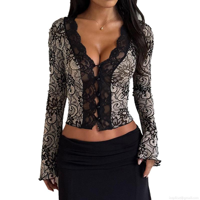 Sexy Deep V Neck Lace Patchwork Blouse Women Long Sleeve Button Down Slim Fit Floral Hollow Out Top Streetwear Clubwear Black