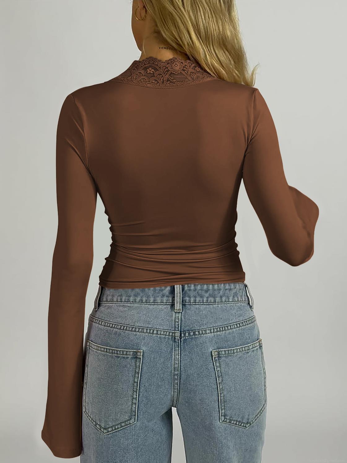 • Sexy Lace V Neck Slim Fit T-Shirt Women Extra Long Flare Sleeve Patchwork Top Y2K Aesthetic Base Shirt Streetwear Clubwear Tee