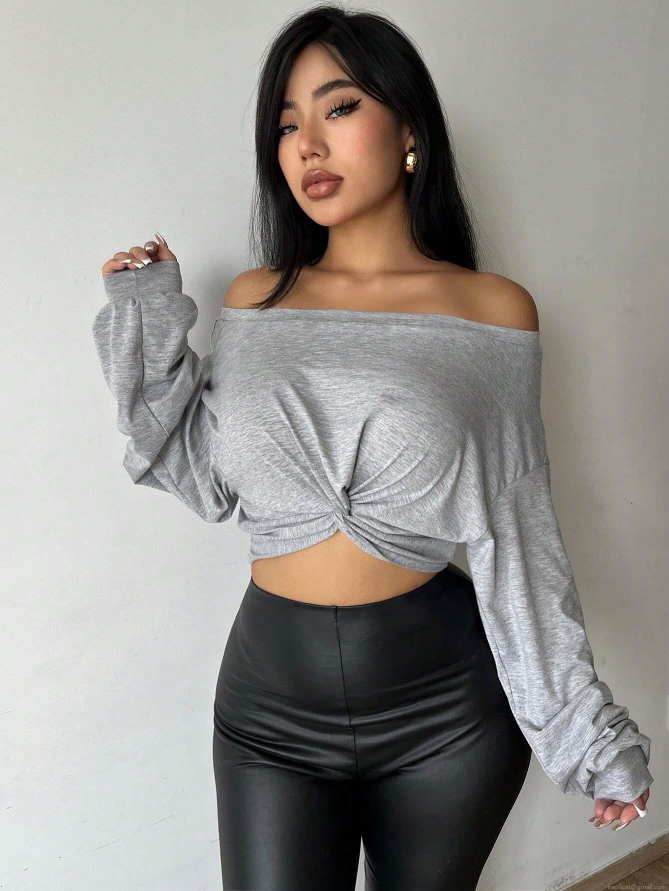 • Sexy Off Shoulder Cropped T-Shirt Cotton Blend Twist Front Long Sleeve Slim Fit Top For Women Fall Winter Fashion Elegant Spicy Girl Casual Solid Grey