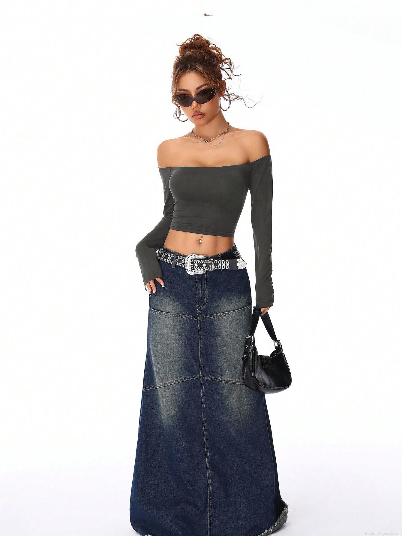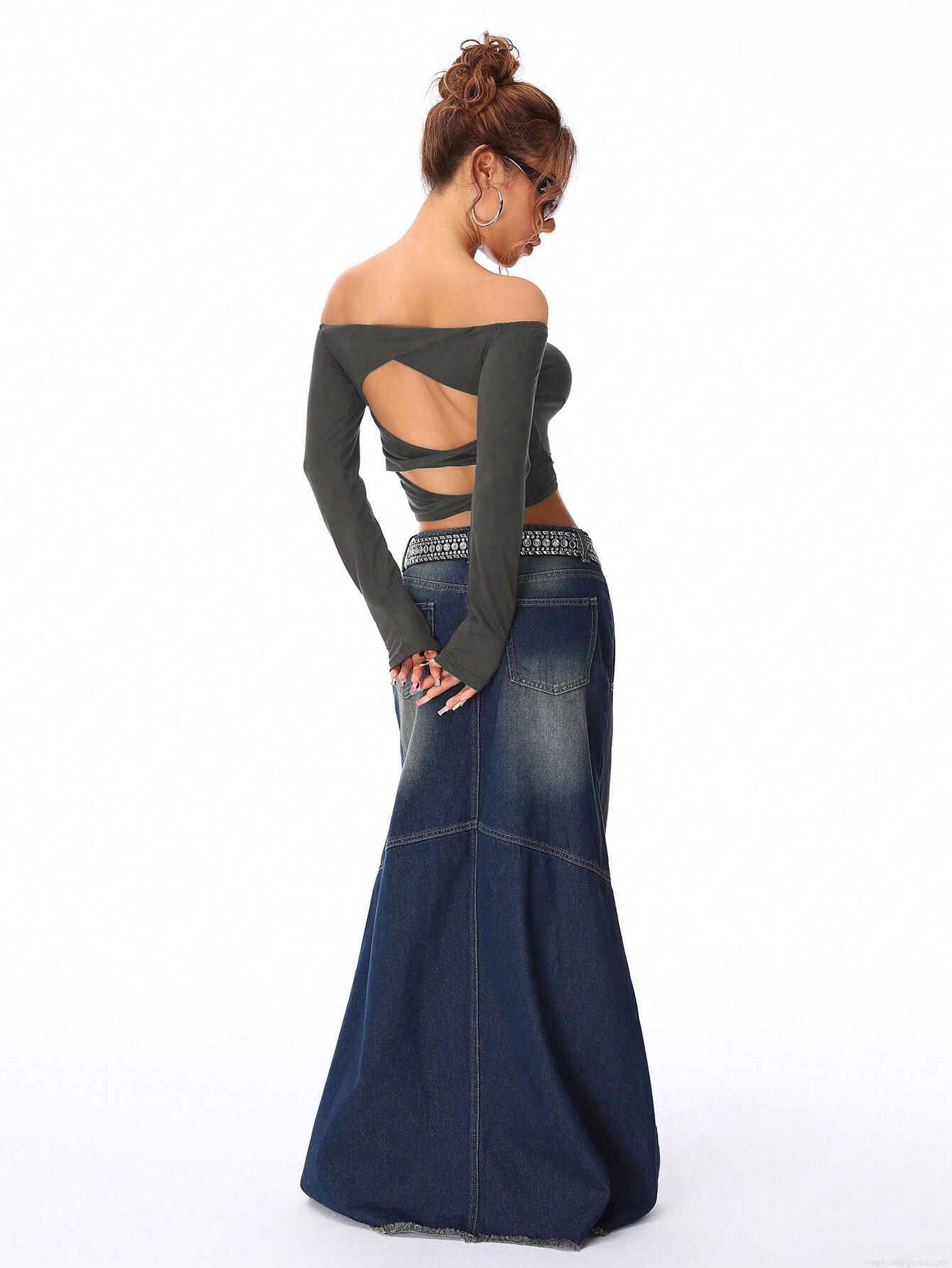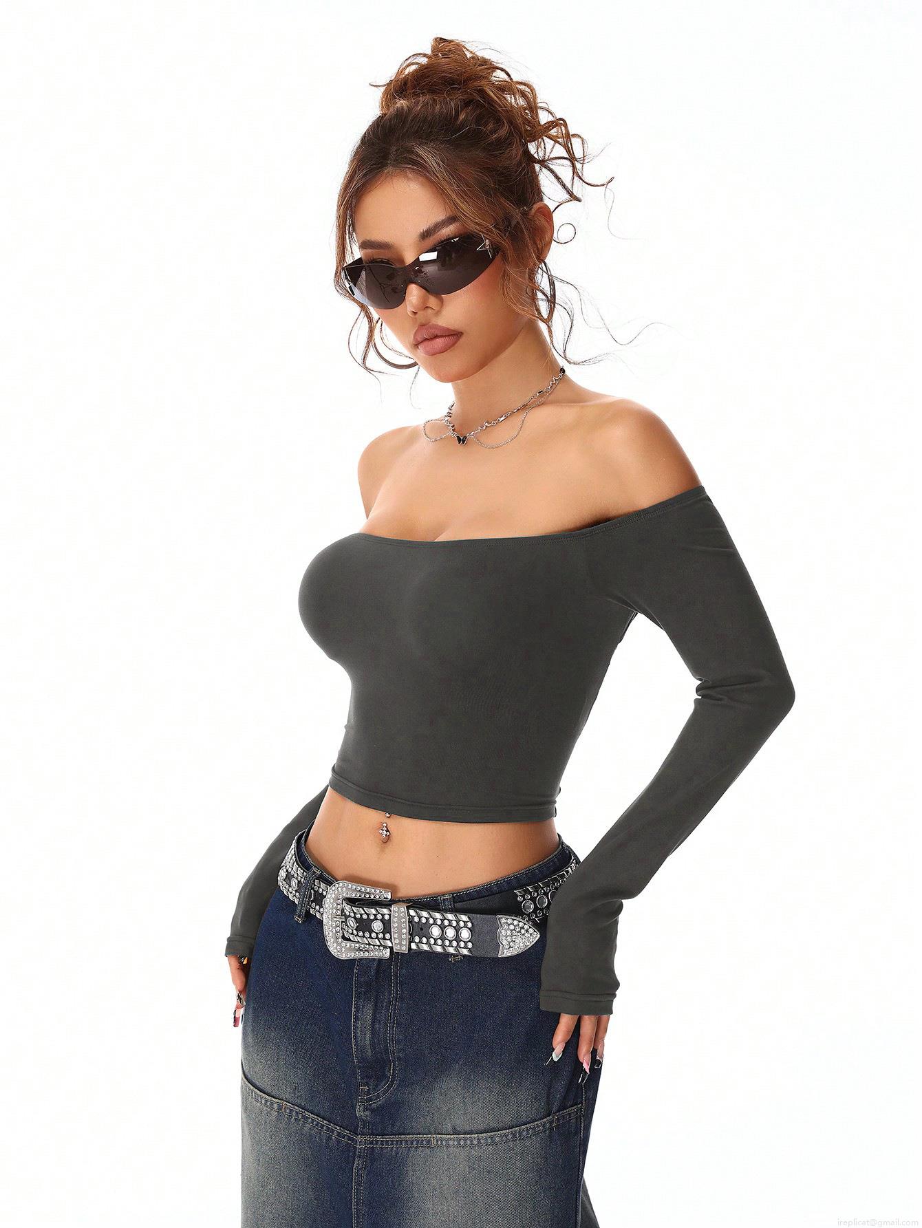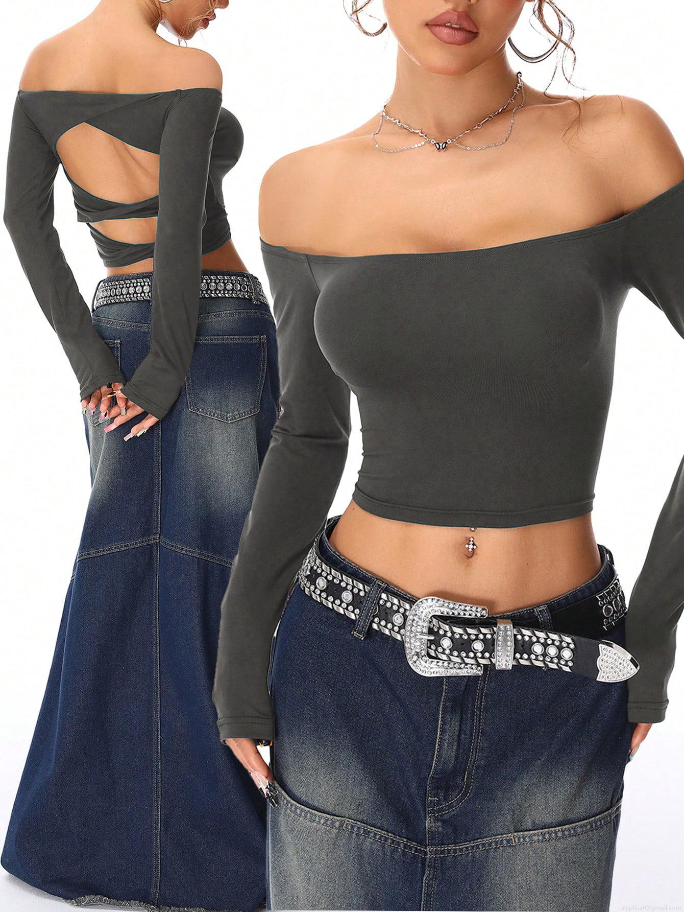 • Sexy Off Shoulder Long Sleeve Crop Top Women Grey Backless Criss Cross Slim Fit Knit T-Shirt Elegant Party Club Streetwear Tee