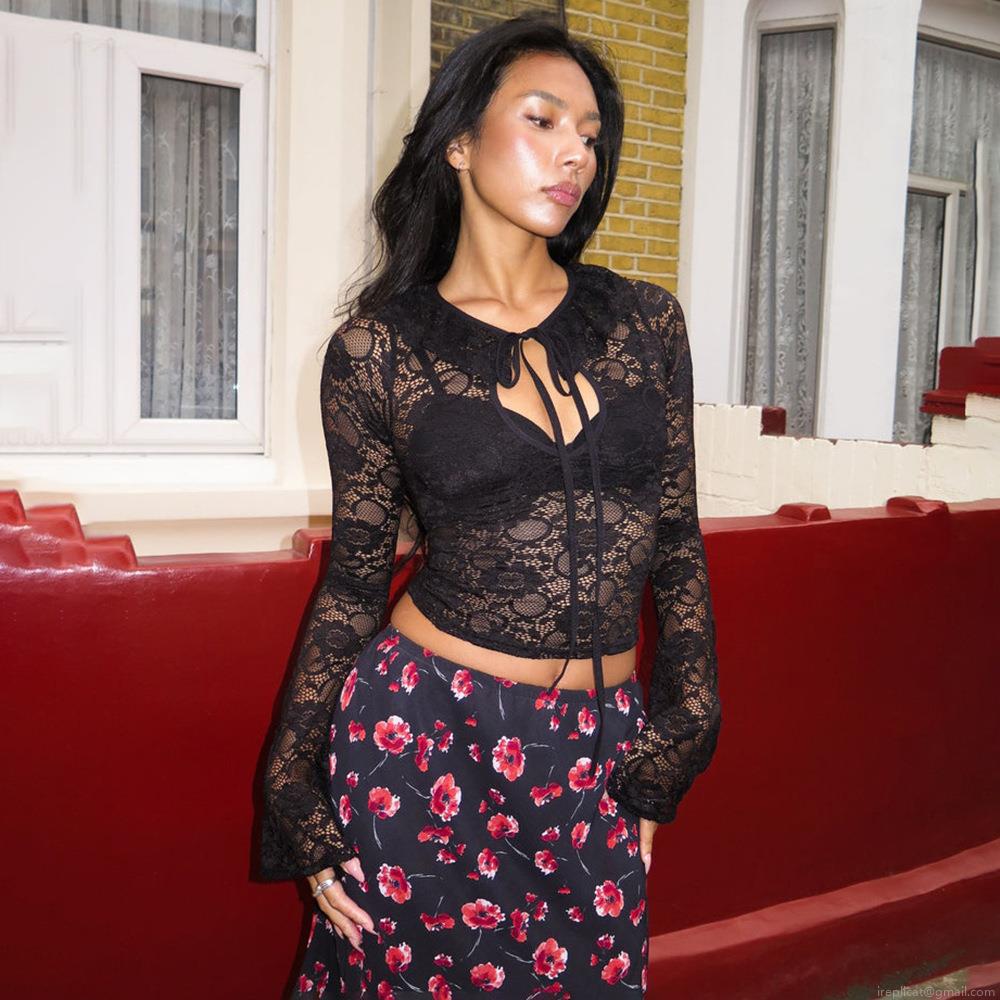 Sexy Perspective Lace Long Sleeve Crop Top For Women Chic Tie-Up Front Sheer Floral Mesh Polyester T-Shirt Streetwear Clubwear Black