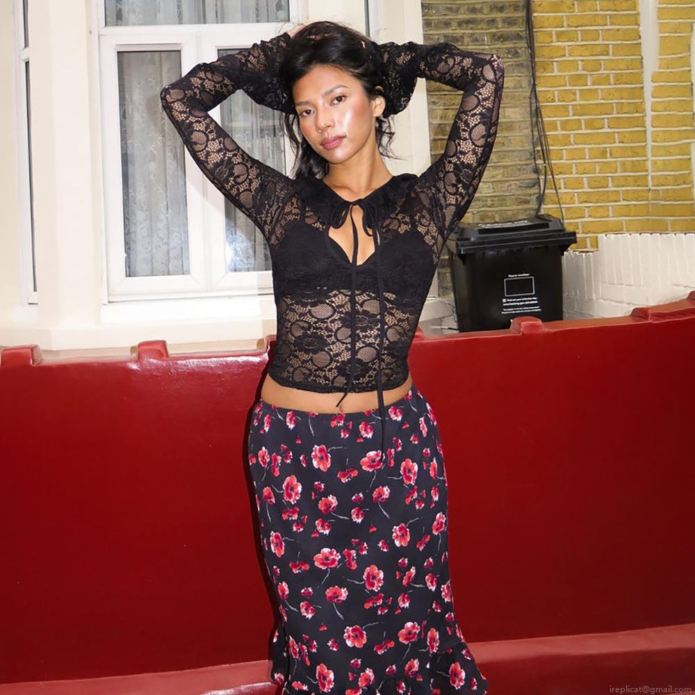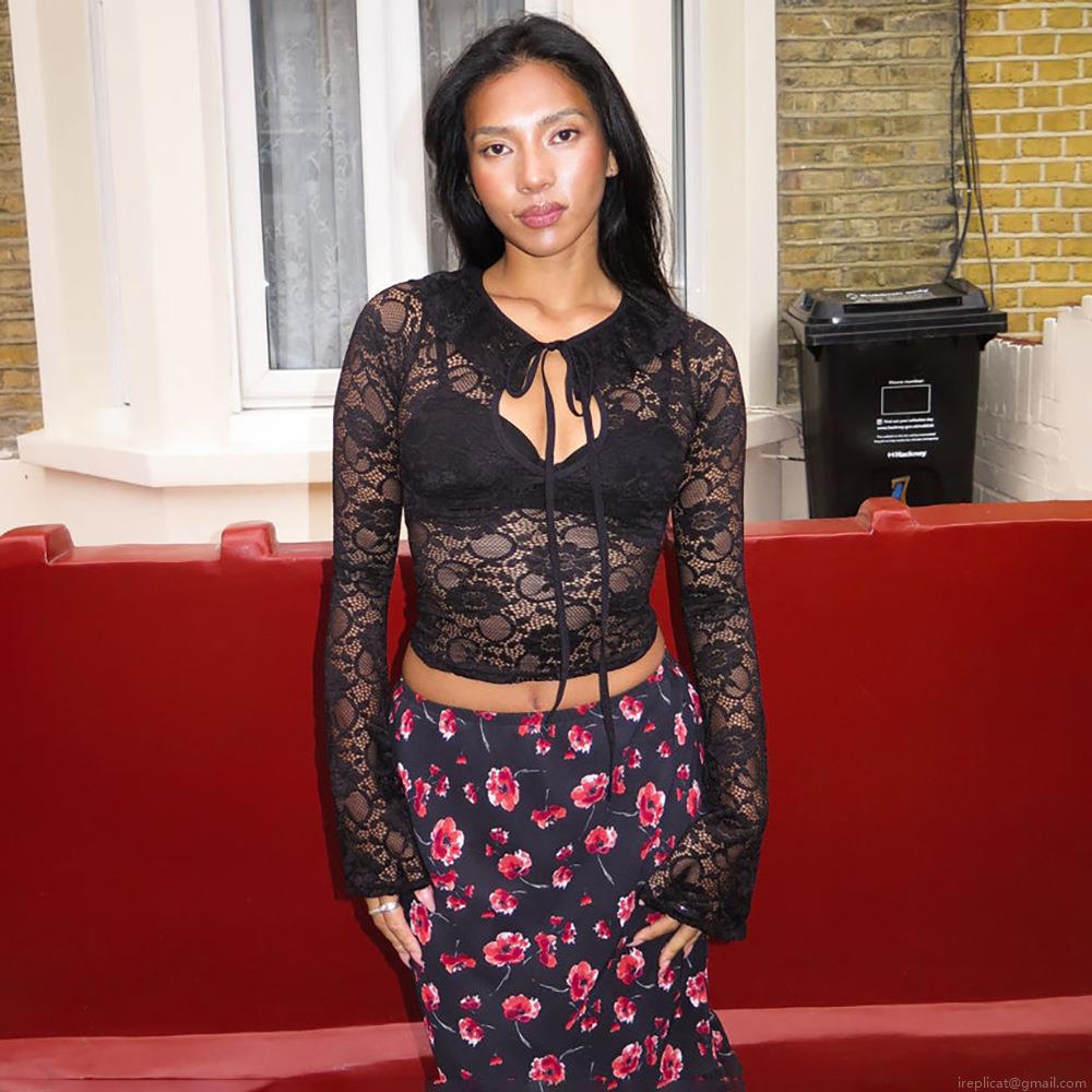 • Sexy Perspective Lace Long Sleeve Crop Top For Women Chic Tie-Up Front Sheer Floral Mesh Polyester T-Shirt Streetwear Clubwear Black