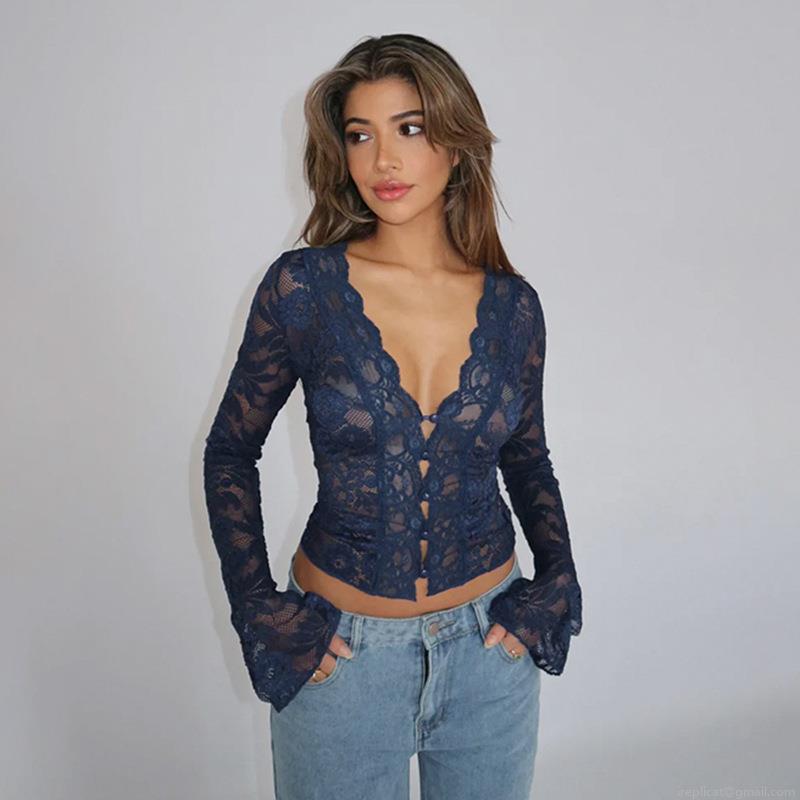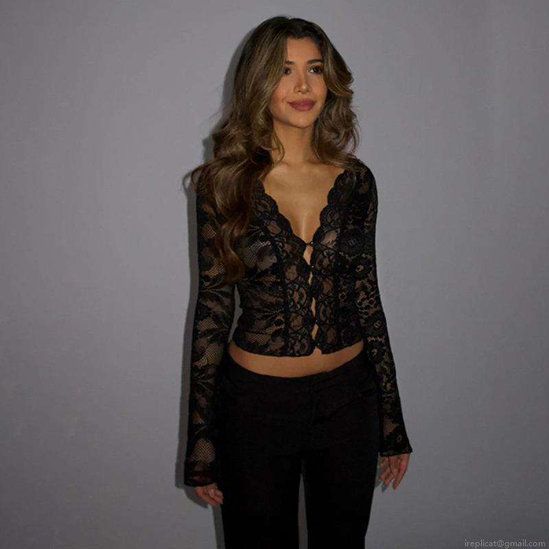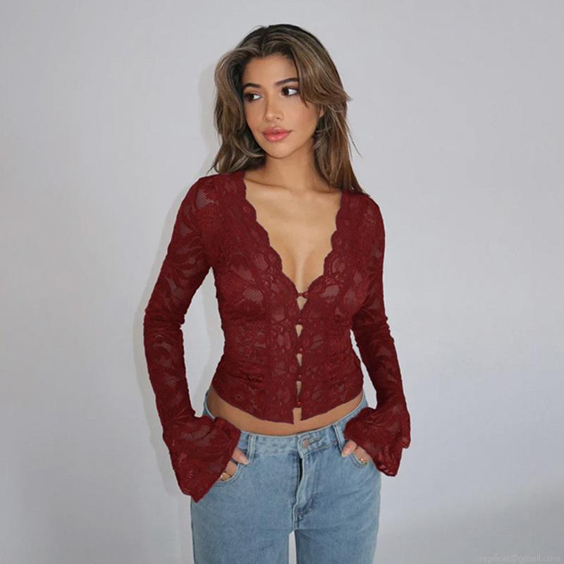 • Sexy V-Neck Lace Patchwork Polyester Spandex Long Sleeve Crop Top Flare Sleeve Button Up Slim Fit Women Party Blouse