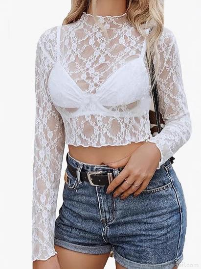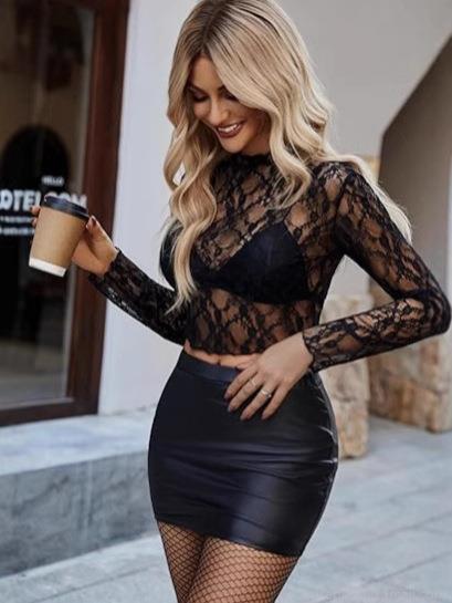 • Sexy Women Lace Crop Top Long Sleeve Hollow Out See Through Mesh Slim Fit Mock Neck Tee Shirt For Party Clubwear Summer Daily Wear