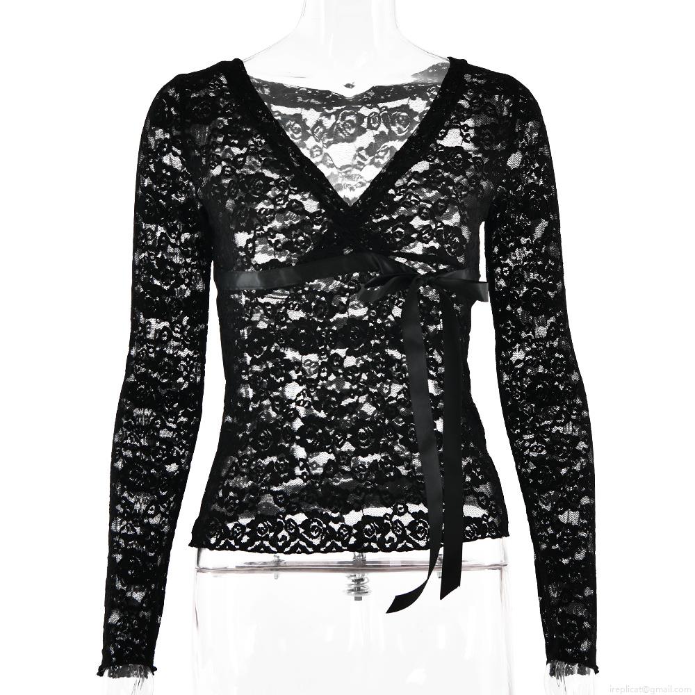 • Sexy Women Sheer Floral Lace Top V Neck Long Sleeve Slim Fit Pullover With Bow Tie Ribbon Decoration Polyester Lace T-Shirt For Party Streetwear