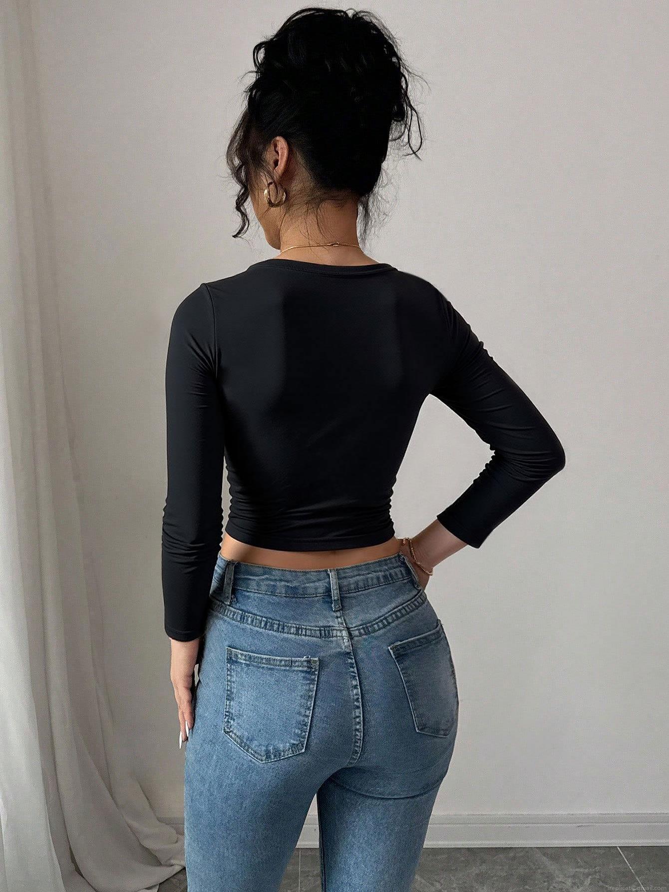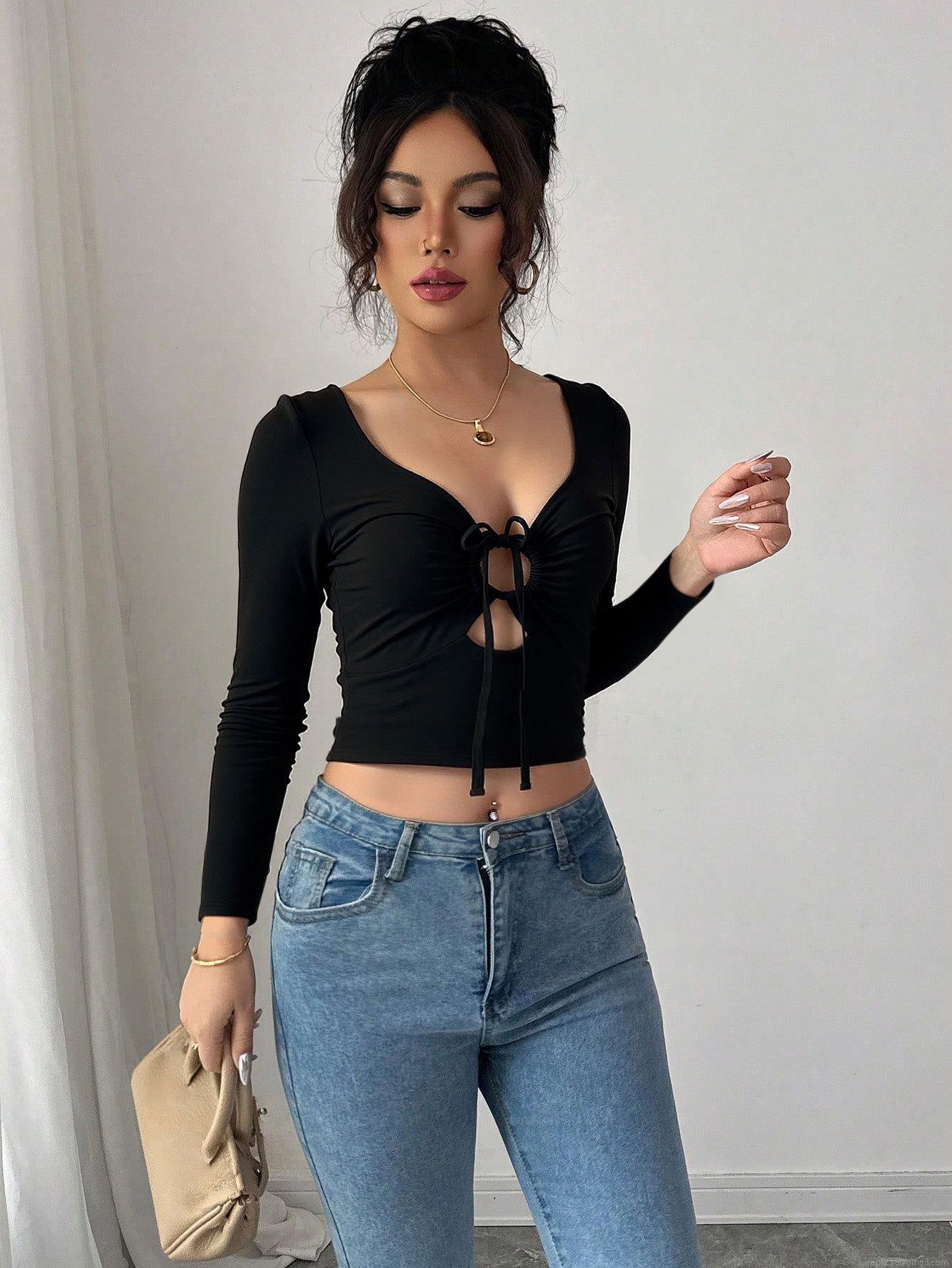 • Sexy Women's Black V-Neck Hollow Out Cropped T-Shirt Milk Silk Long Sleeve Drawstring Ruched Slim Fit Clubbing Top