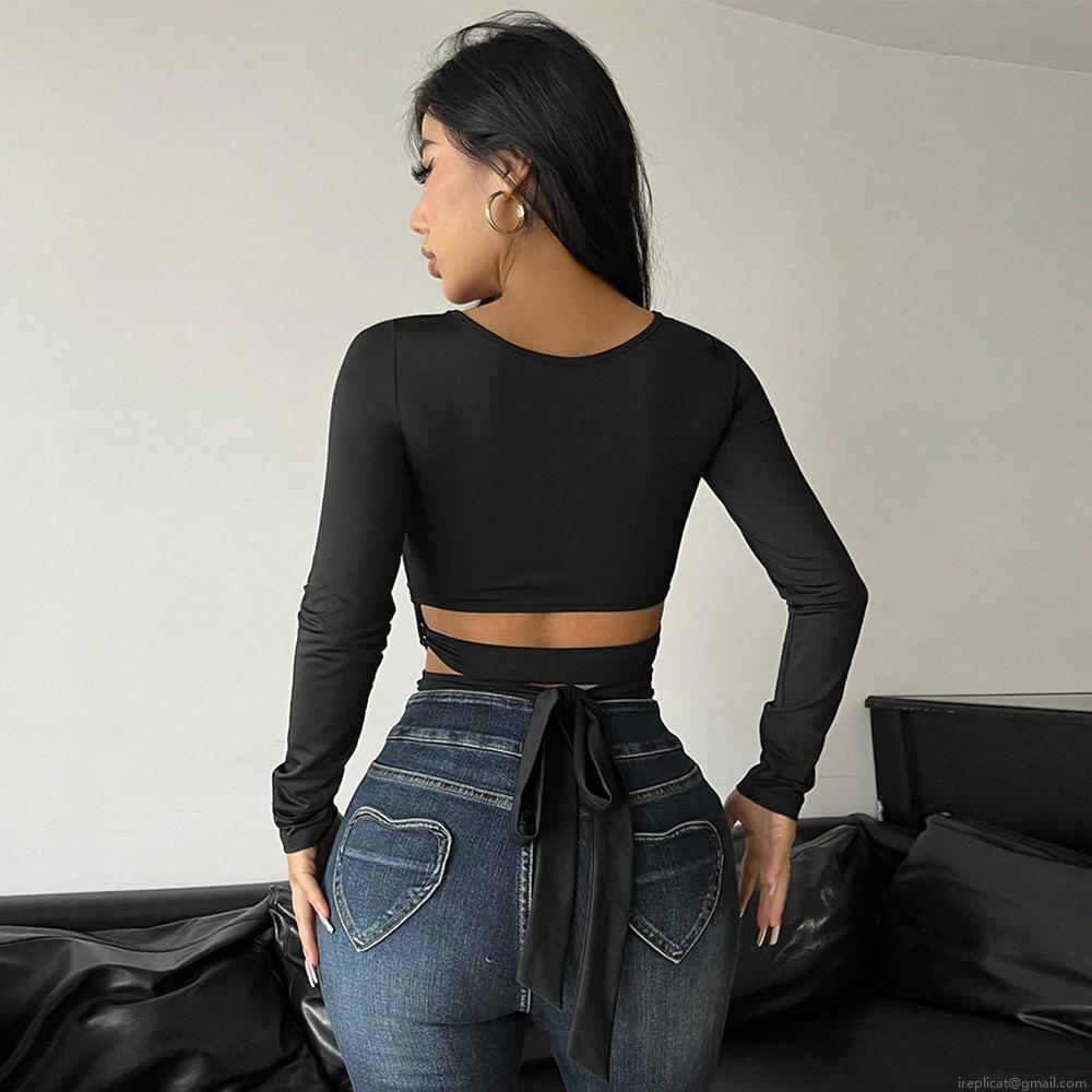 • Sexy Women's Long Sleeve Crop Top Polyester Spandex Heart Neck Drawstring Cut Out Slim Fit T-Shirt Y2K Aesthetic Streetwear Party Top Black