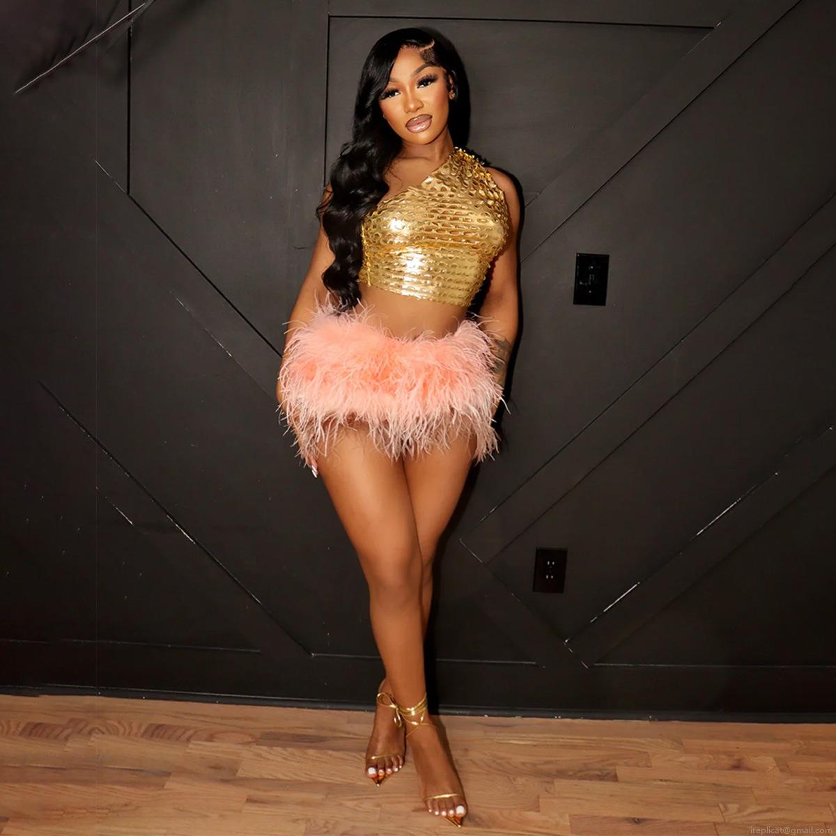• Sexy Women's One Shoulder Laser Cut Out Metallic Gold Crop Top Fish Scale Hollow Sleeveless Tank Top Party Nightclub Streetwear Shirt