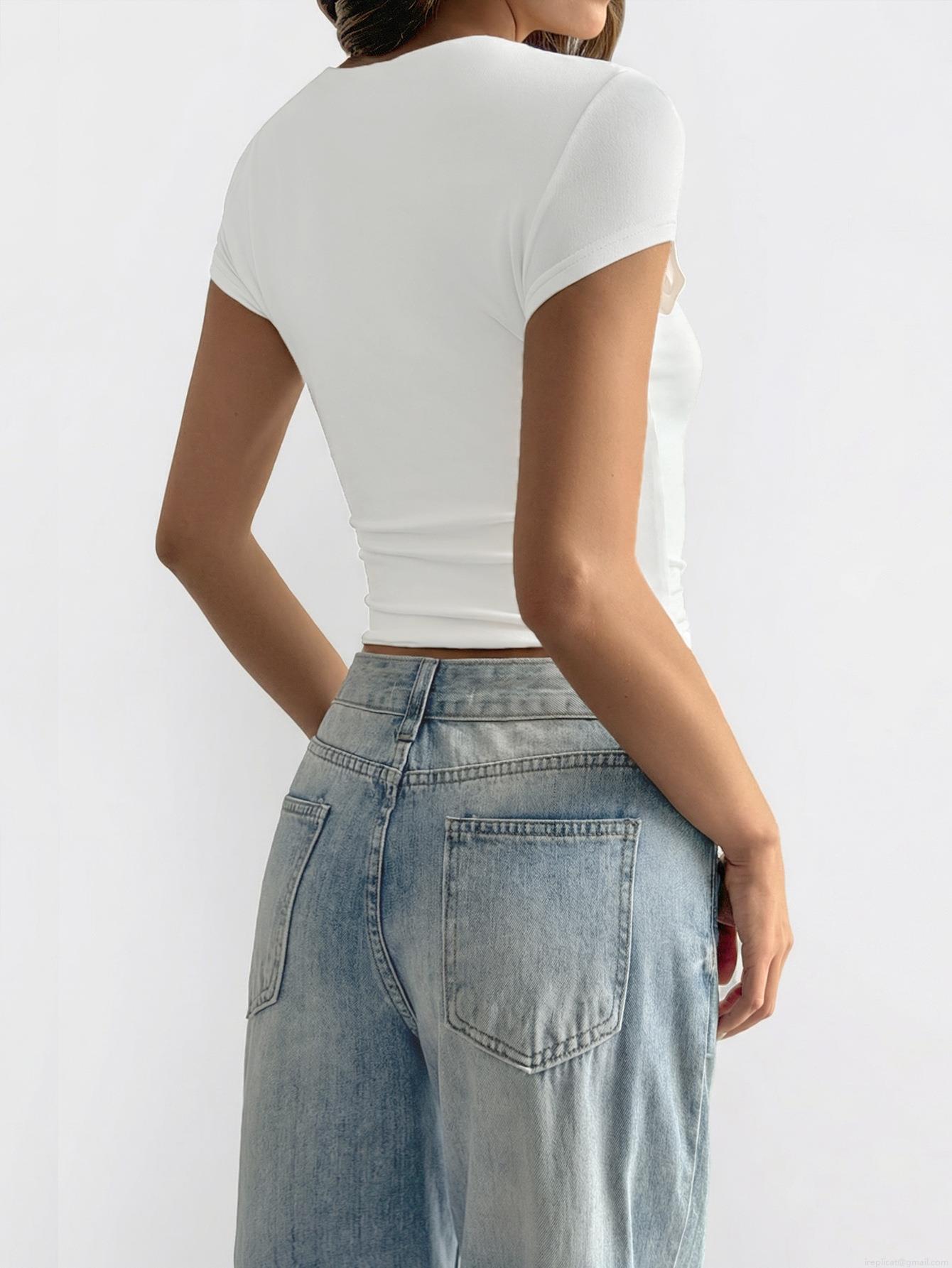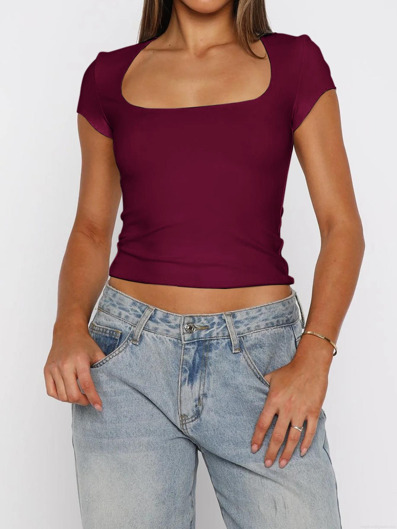 • Sexy Y2K Women's Square Neck Short Sleeve Crop Top Solid Color Tight Fit Polyester and Elastane T-Shirt Basic Versatile Summer Streetwear