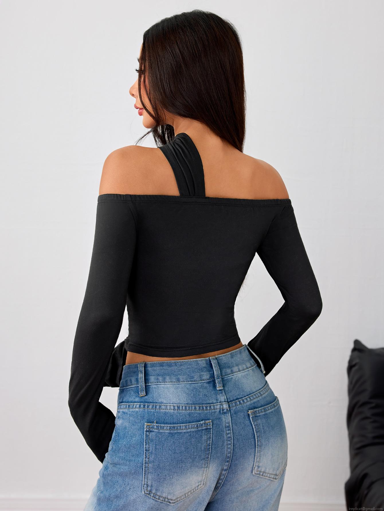 • Women Asymmetrical Slant Shoulder Long Sleeve Crop Top Polyester Elastane Slim Fit Streetwear Top With Waist Tie For Daily Clubwear Fashionable Lady