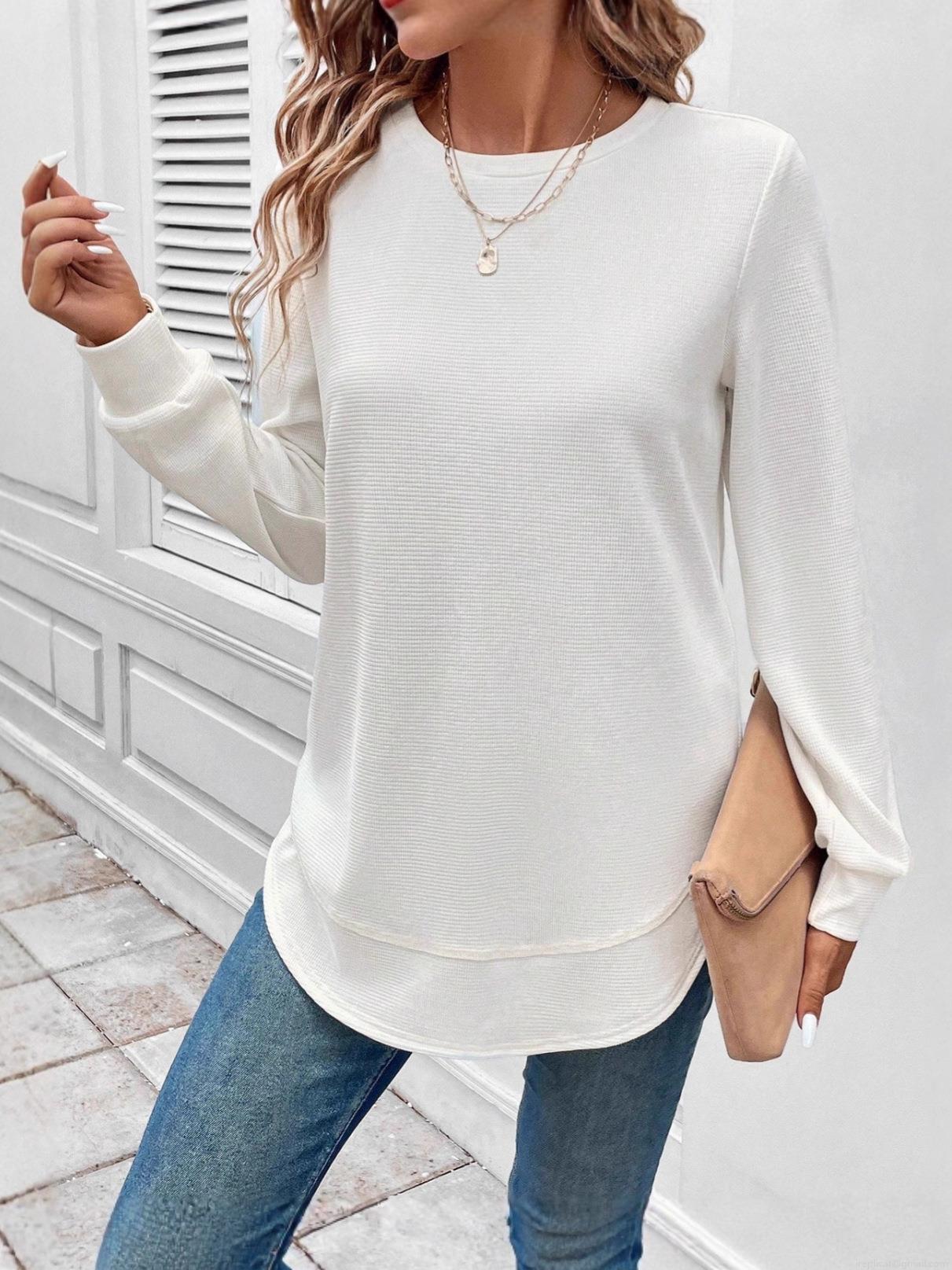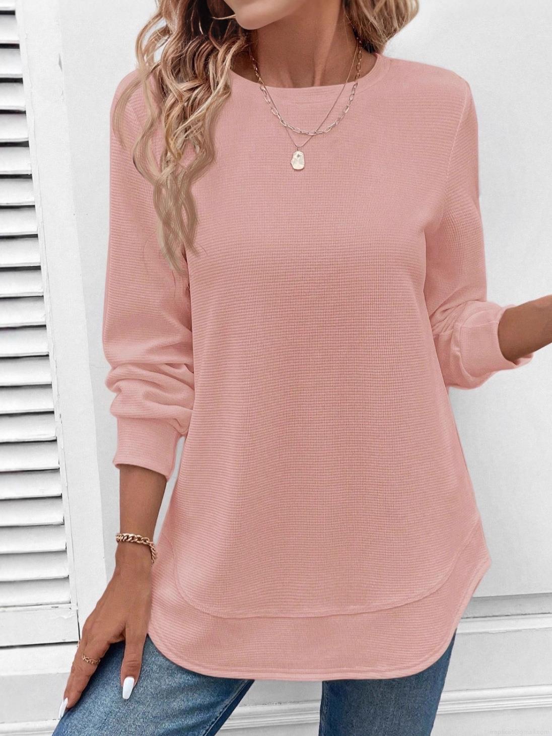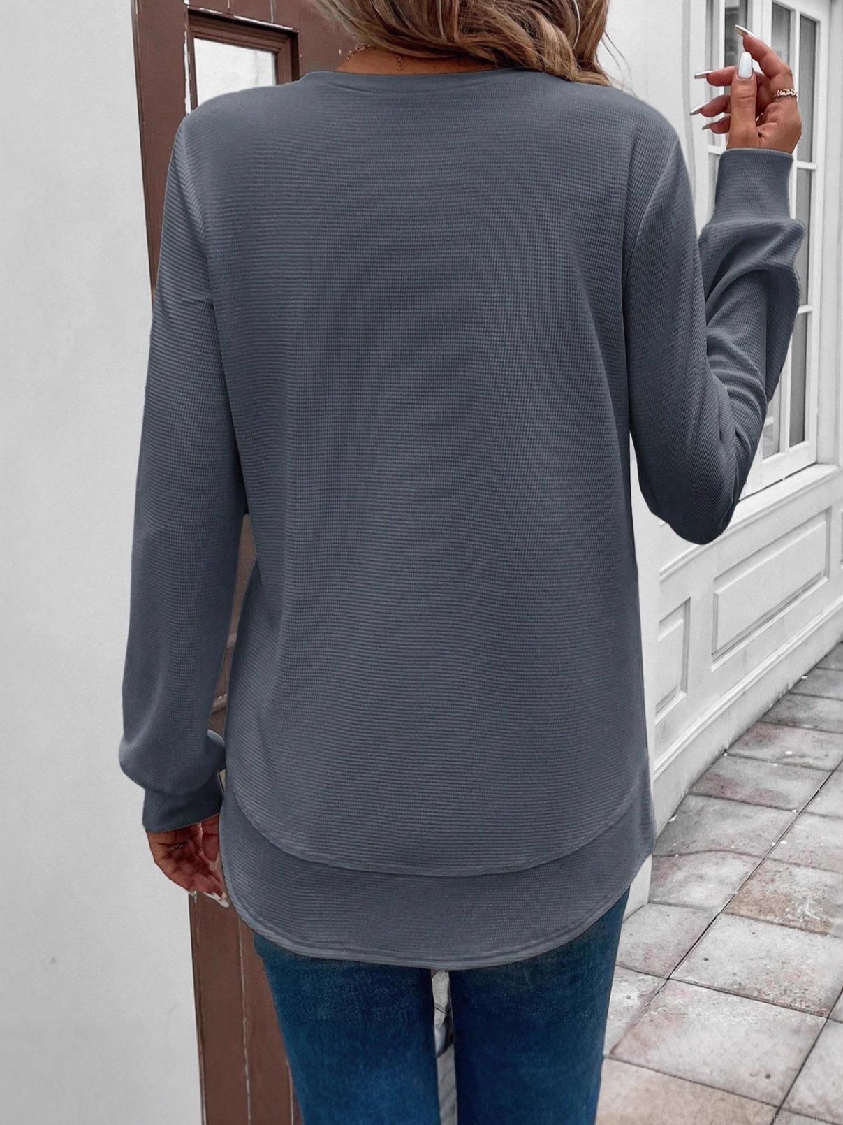 • Women Casual Waffle Knit Long Sleeve T-Shirt Round Neck Asymmetrical Layered Hem Solid Color Loose Top Autumn Winter Fashion Tee