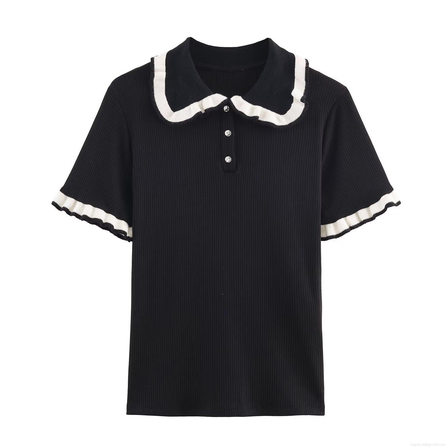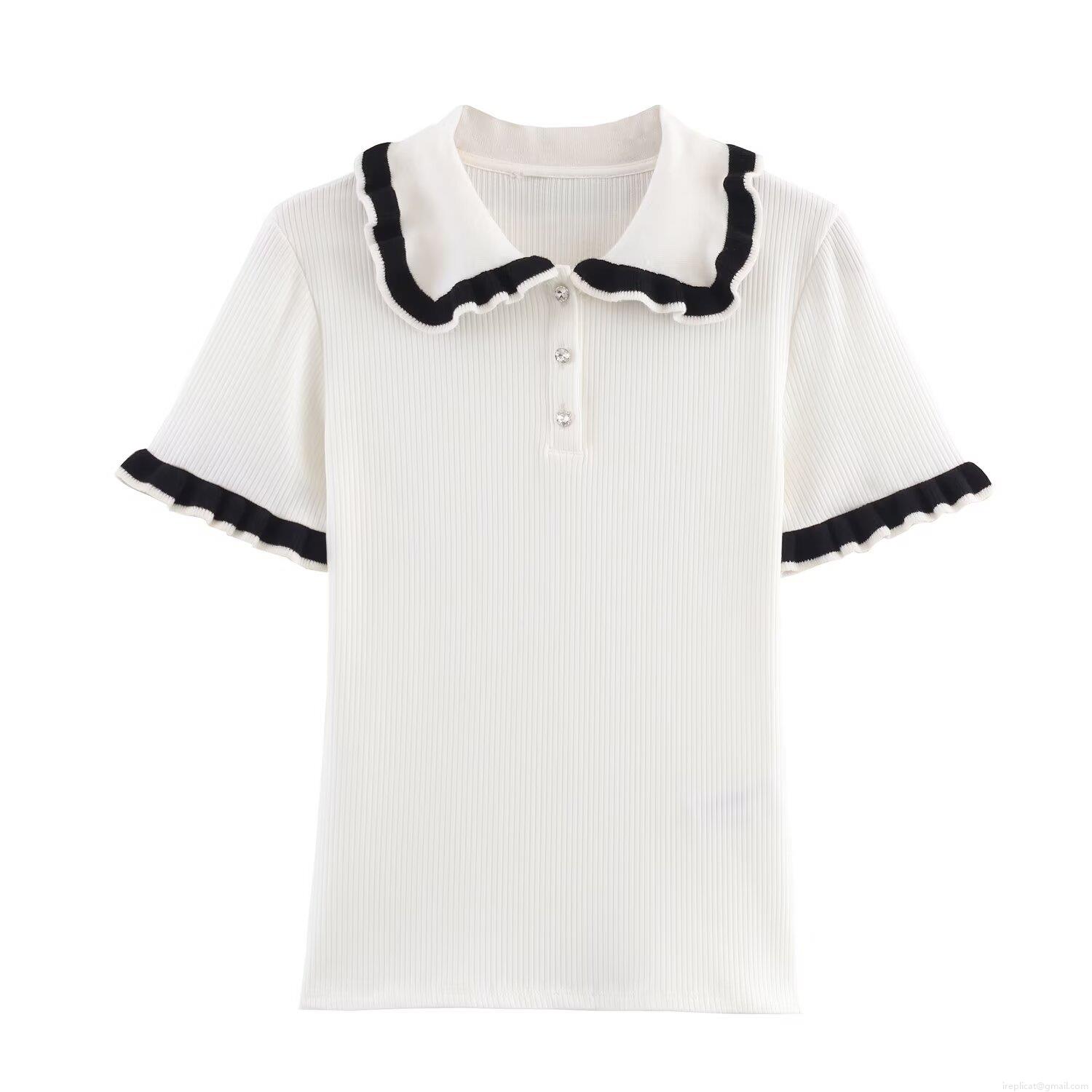 Women Contrast Color Wood Ear Edge Ribbed Knit POLO T-Shirt Loose Short Sleeve Polyester Top With Rhinestone Buttons Casual Summer Streetwear Fashion