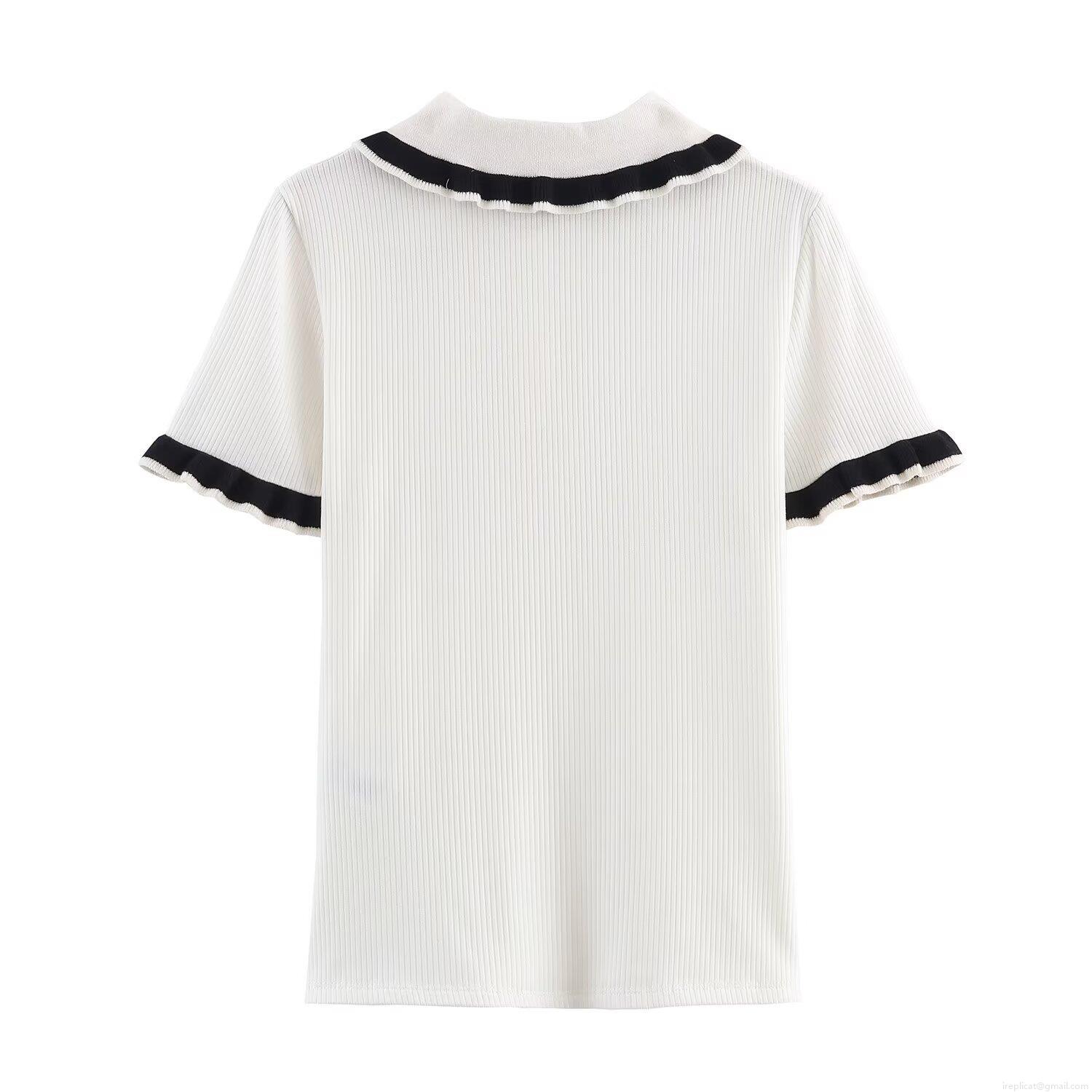 • Women Contrast Color Wood Ear Edge Ribbed Knit POLO T-Shirt Loose Short Sleeve Polyester Top With Rhinestone Buttons Casual Summer Streetwear Fashion