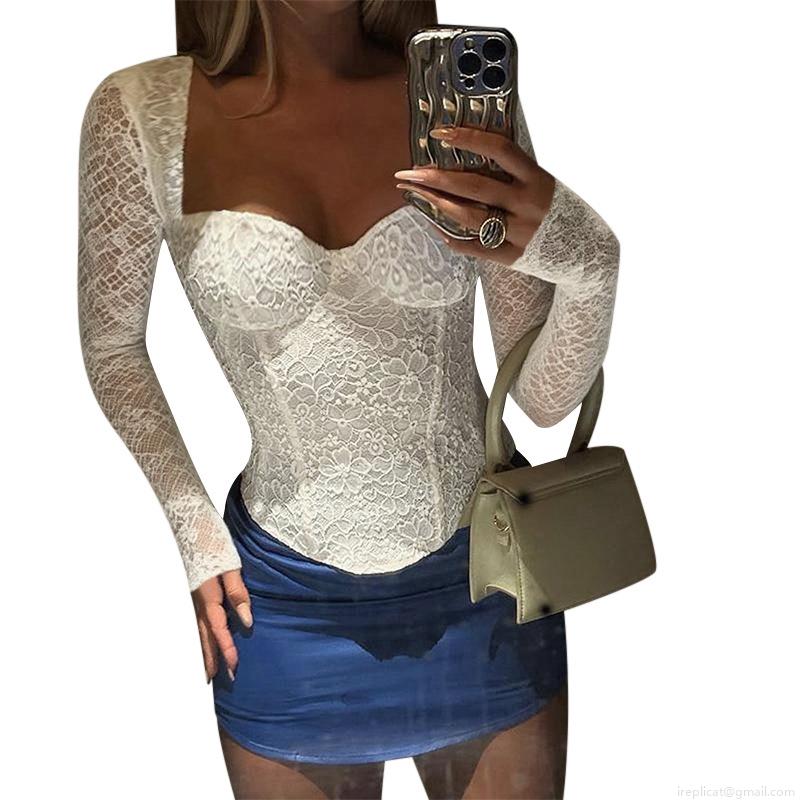 • Women Elegant Lace Corset Top Long Sleeve V Neck Slim Fit Boned Tee Polyester Spandex Vintage Style White Blouse Sexy Clubwear Party Top
