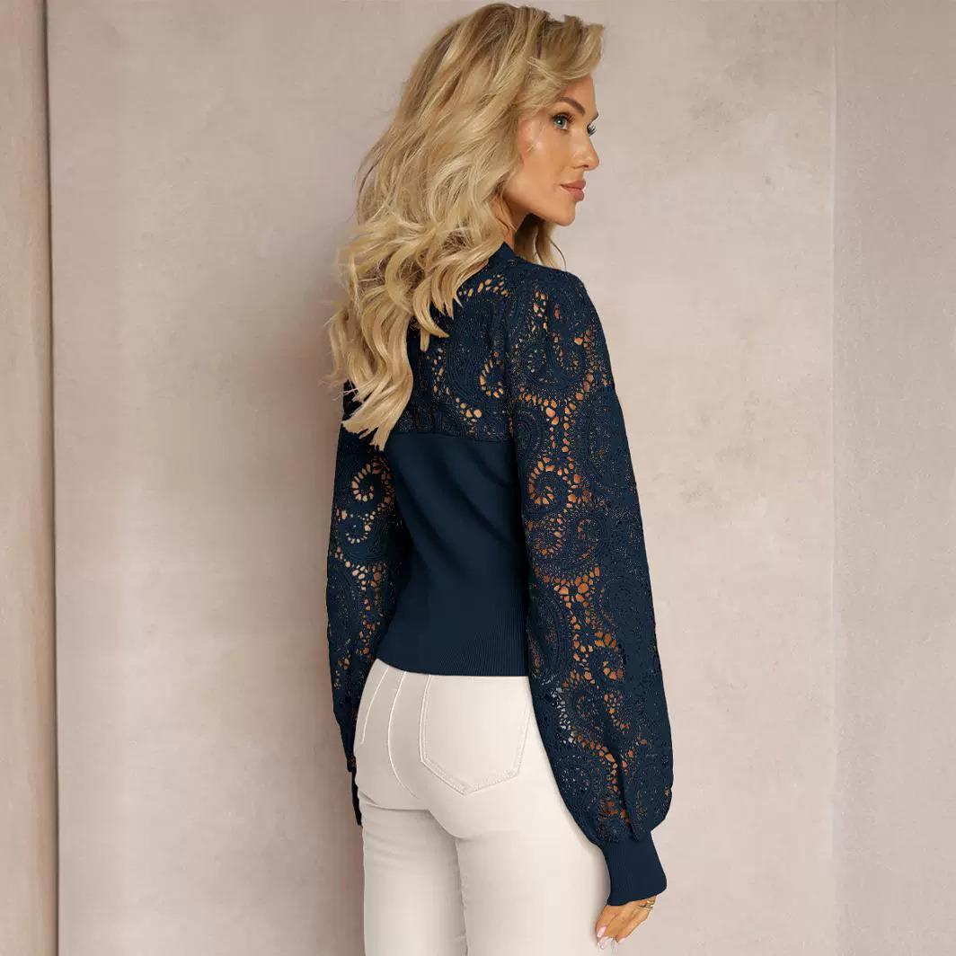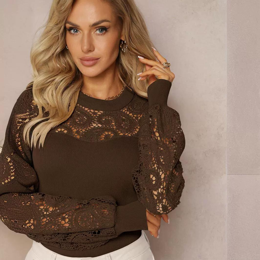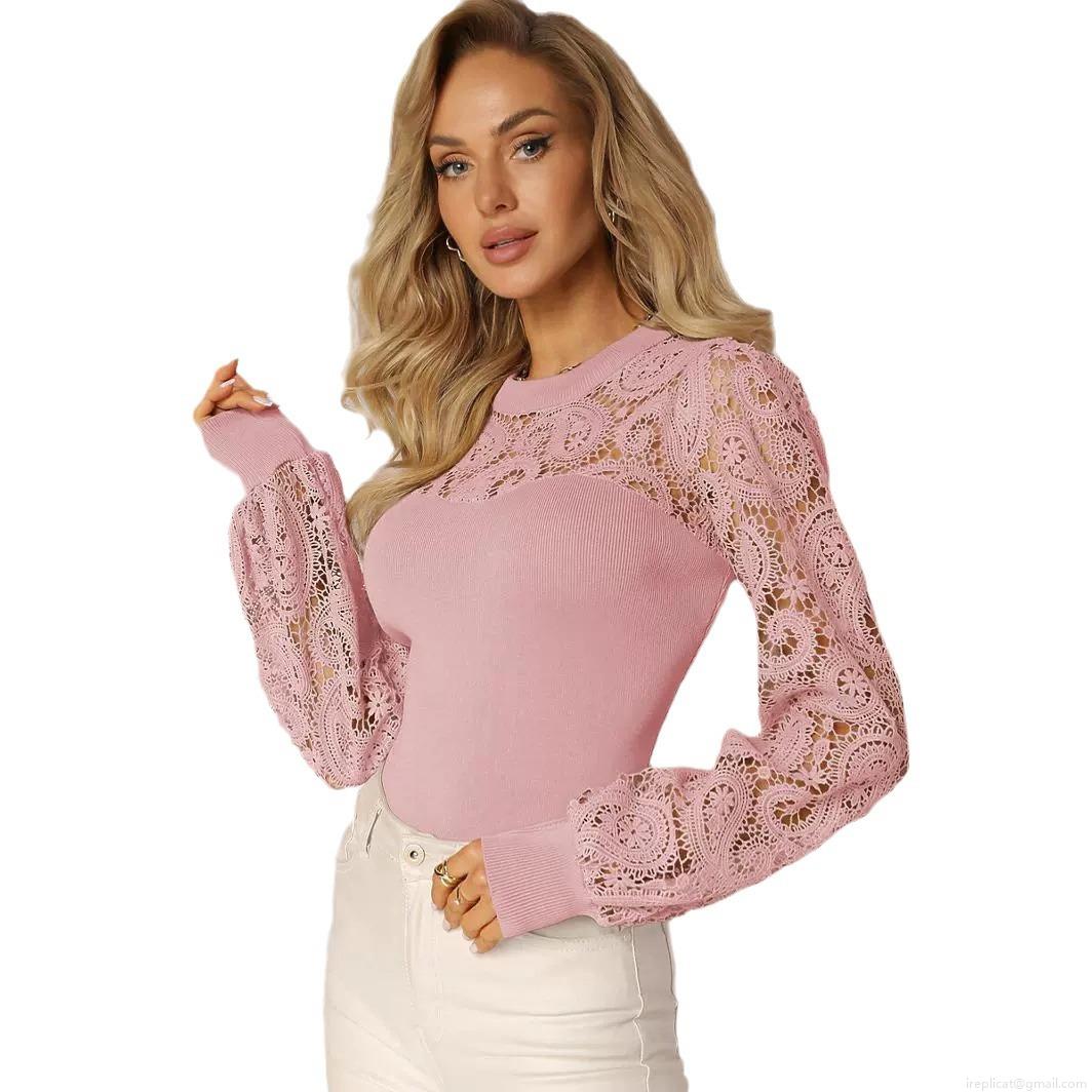 • Women Elegant Lace Splicing Long Sleeve T-Shirt Viscose Rib Knit Hollow Out Crew Neck Blouse Top For Office Party Lady