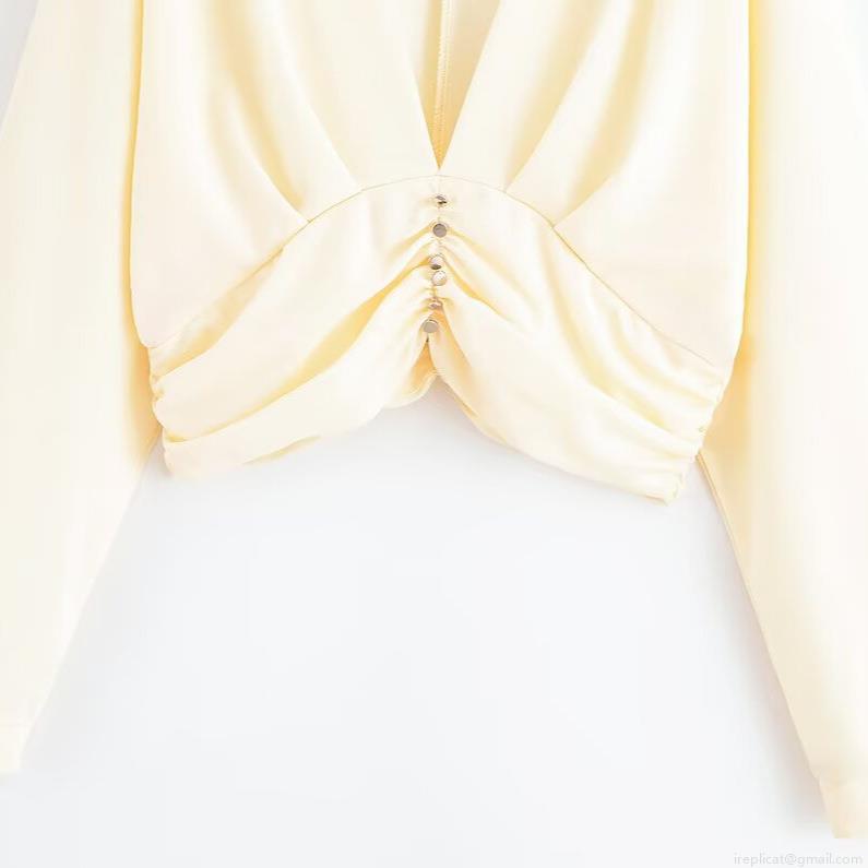 • Women Elegant Solid Color V-Neck Ruched Button Front Long Sleeve Cropped T-Shirt Slim Fit Fashion Blouse Top For Summer