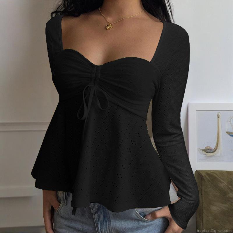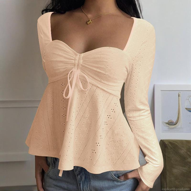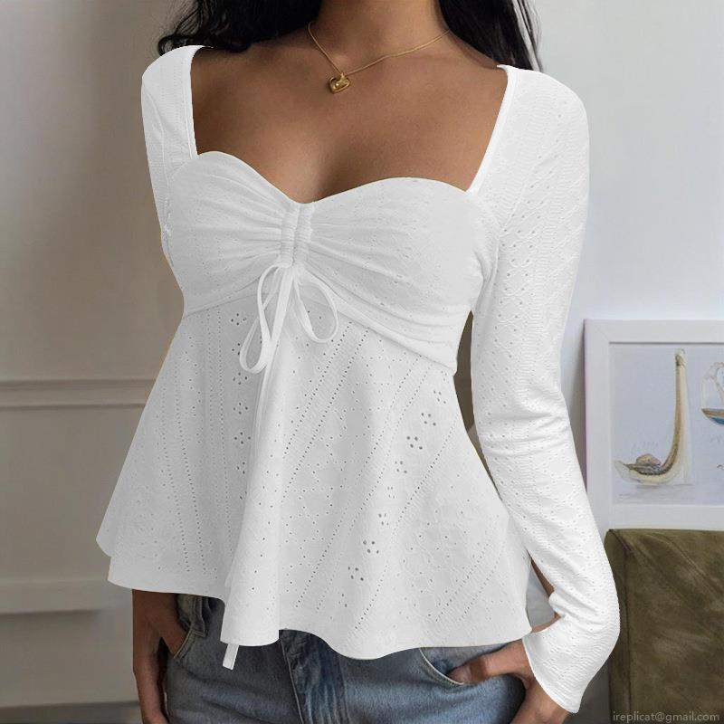 • Women Eyelet Lace T-Shirt Polyester Spandex Long Sleeve Square Neck Drawstring Peplum Top Casual Slim Fit Blouse For Women