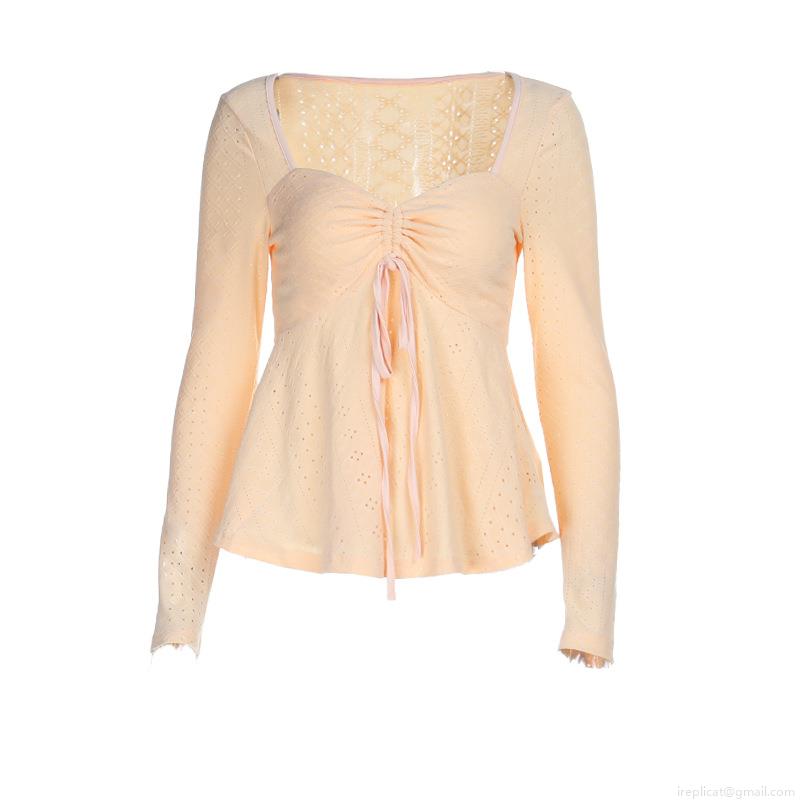 Women Eyelet Lace T-Shirt Polyester Spandex Long Sleeve Square Neck Drawstring Peplum Top Casual Slim Fit Blouse For Women