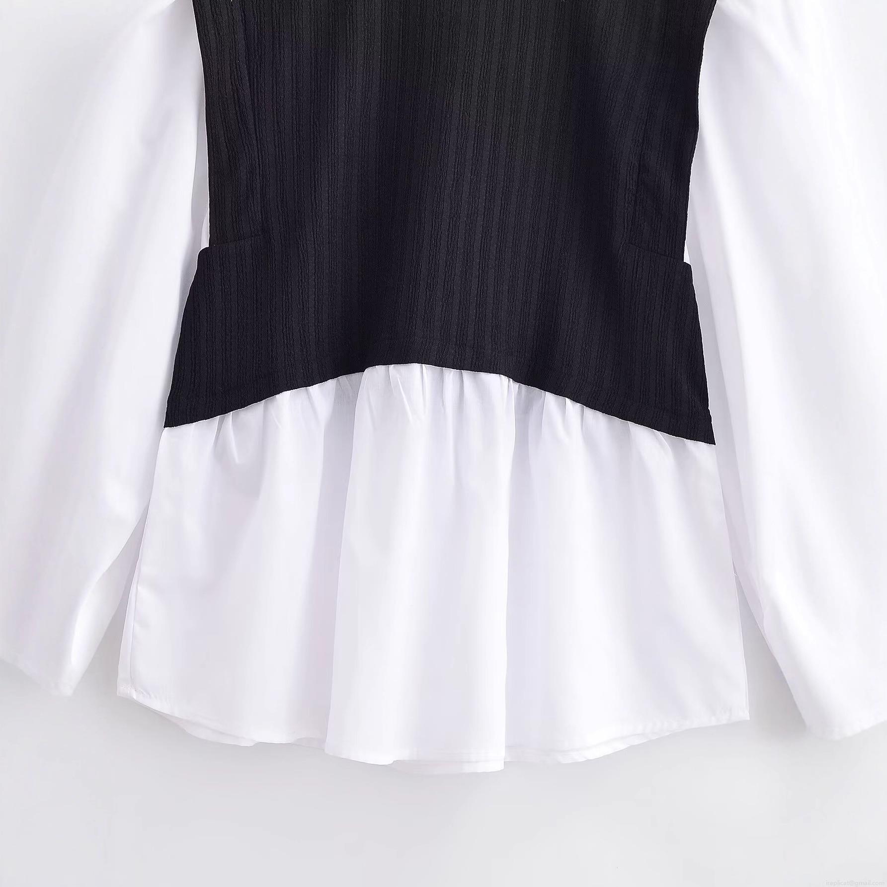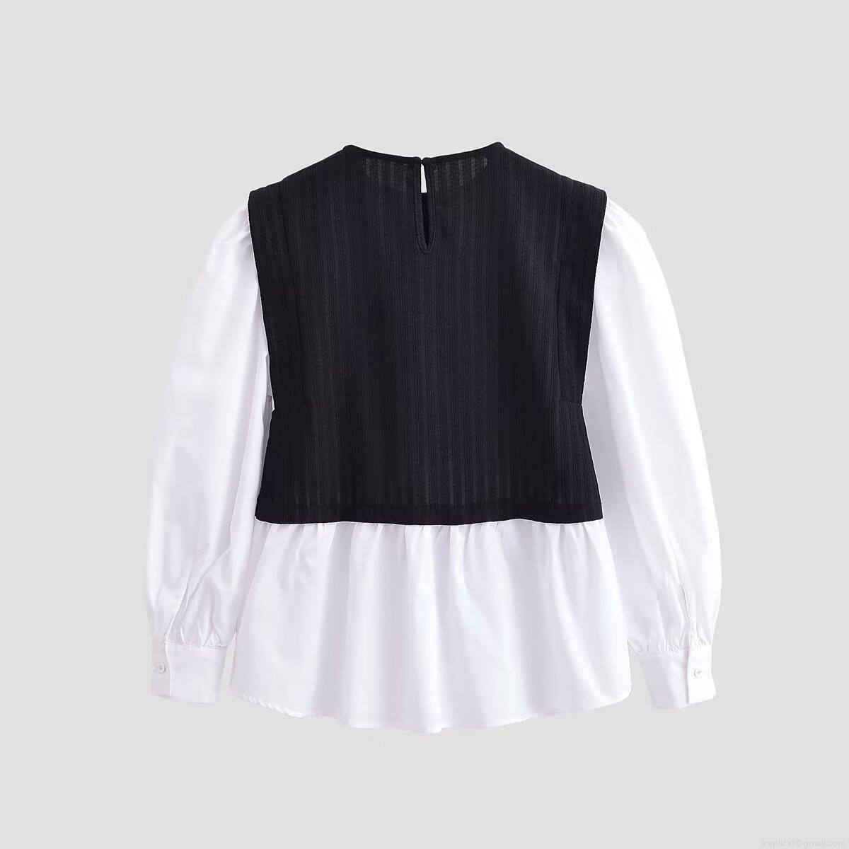 • Women Fashion Fake Two-Piece T-Shirt Long Lantern Sleeve Polyester Color Block Stitching Top Streetwear Occident Style Casual Mock Neck Long Sleeve Tee For Women