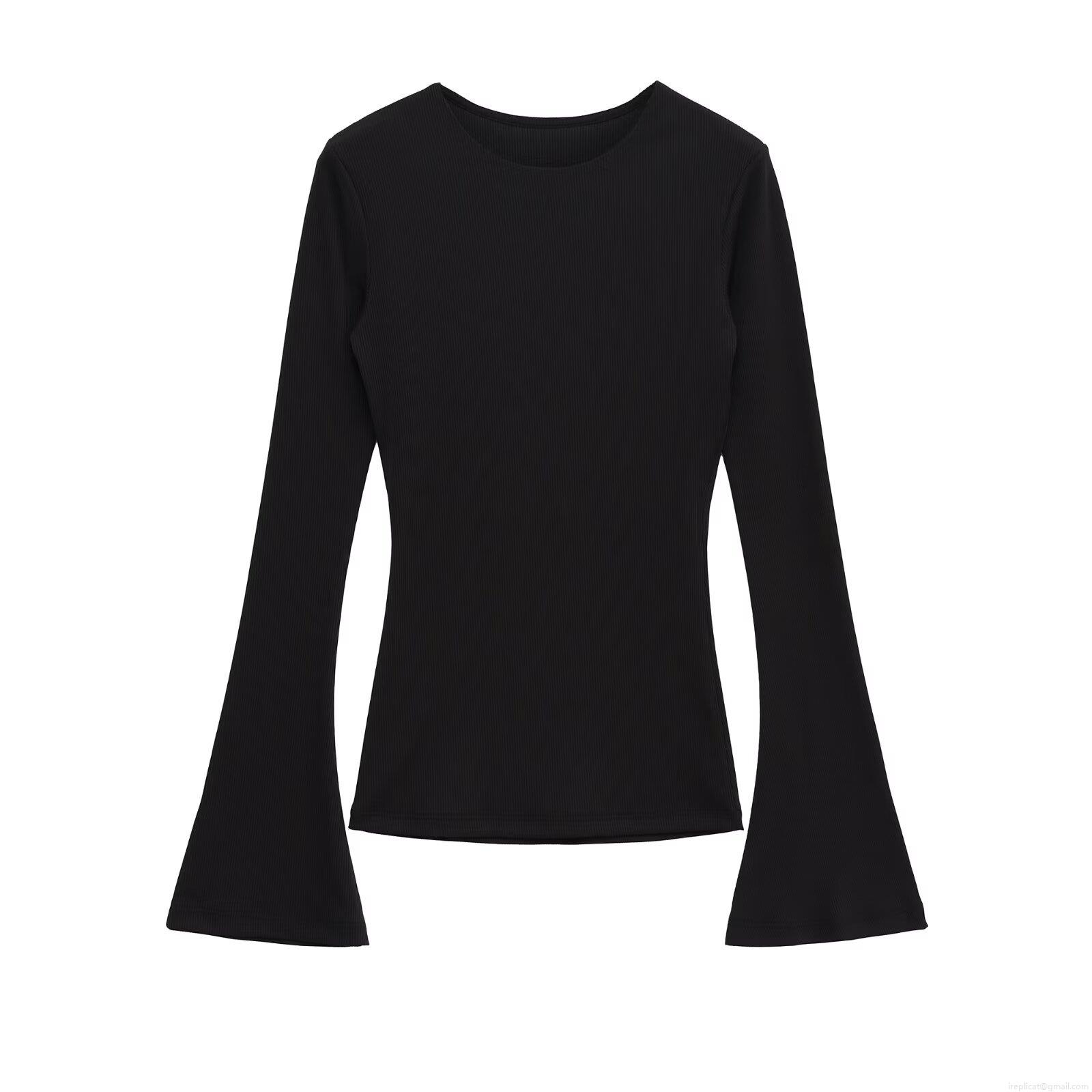 Women Flare Sleeve Ribbed Knit T-Shirt Slim Fit Round Neck Long Sleeve Polyester Casual Streetwear Top for Women Pink Brown Black