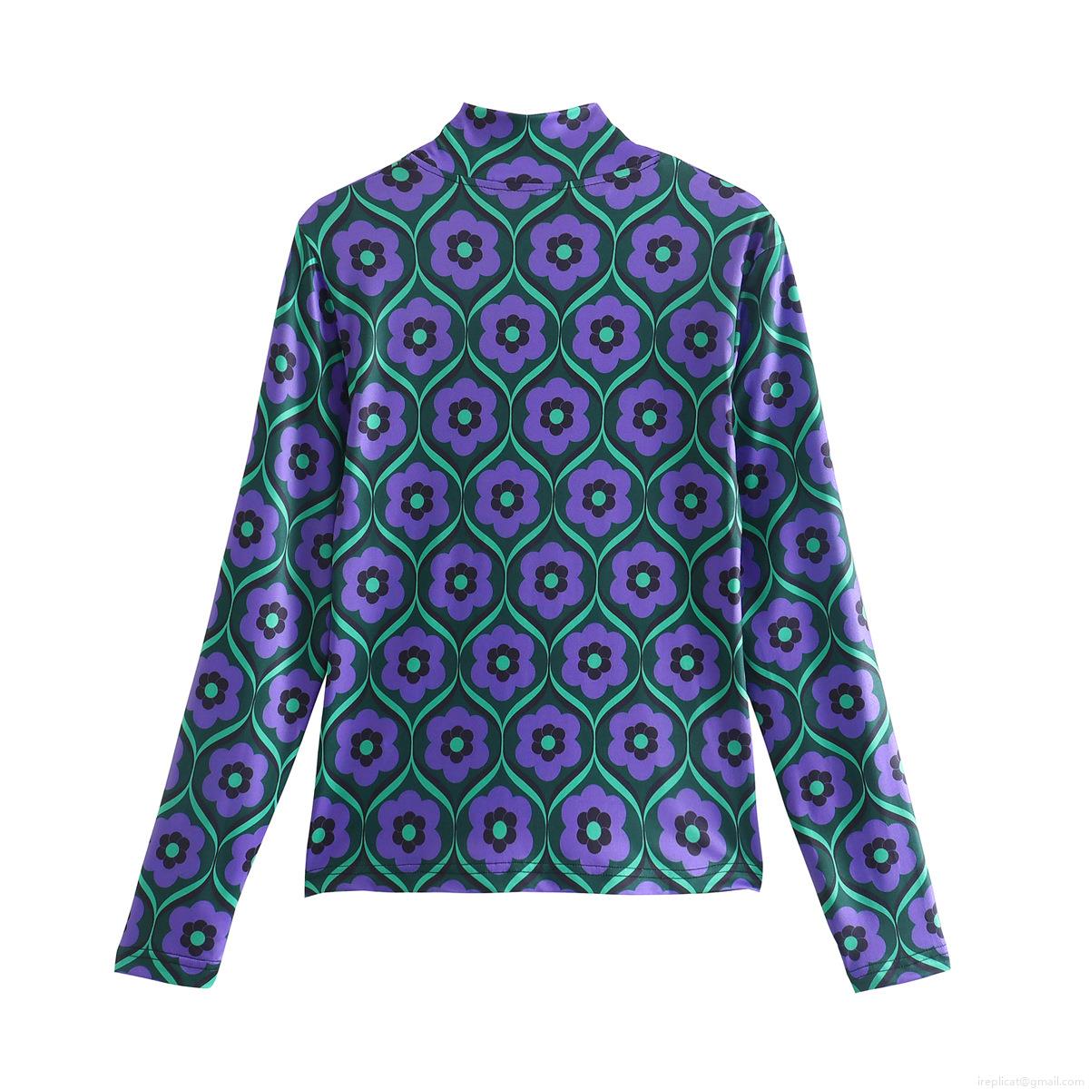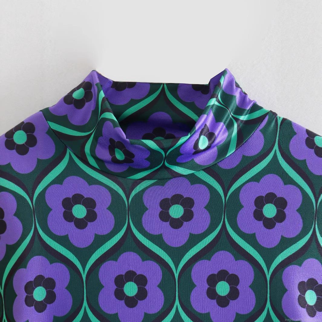 • Women French Retro Floral Print Mock Neck Long Sleeve Slim Fit Top Polyester Spandex Stretchy T-Shirt Elegant Purple Green Flower Base Layer Blouse For Daily Party Casual Dating Women Clothing