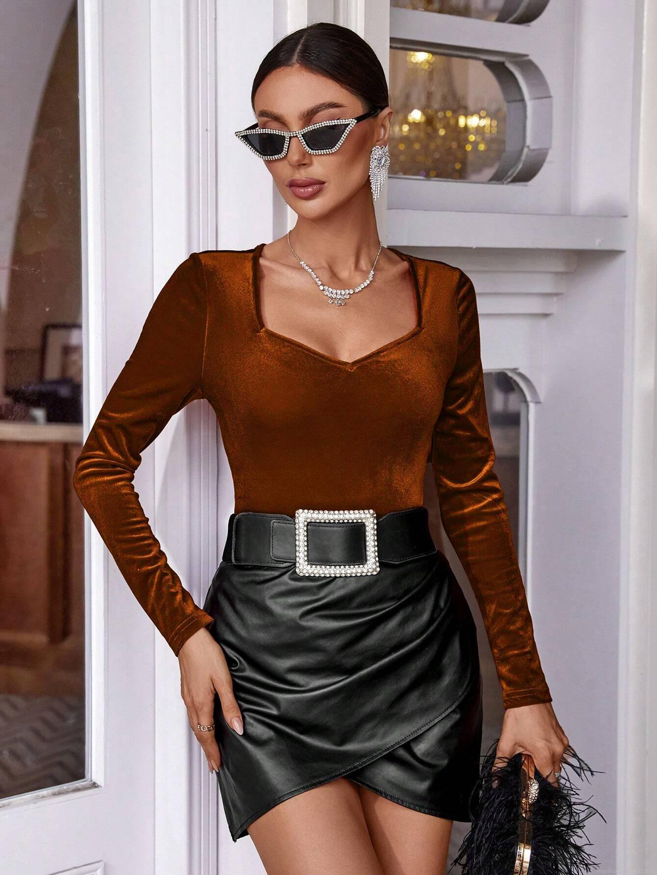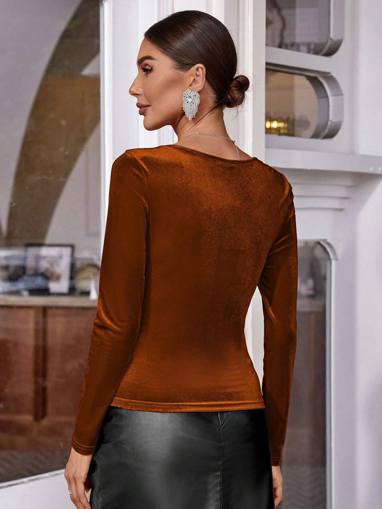 • Women French Square Neck Long Sleeve T-Shirt Elegant Slim Fit Velvet Velour Top Solid Caramel Brown Fall Winter Commuter Pullover Tee