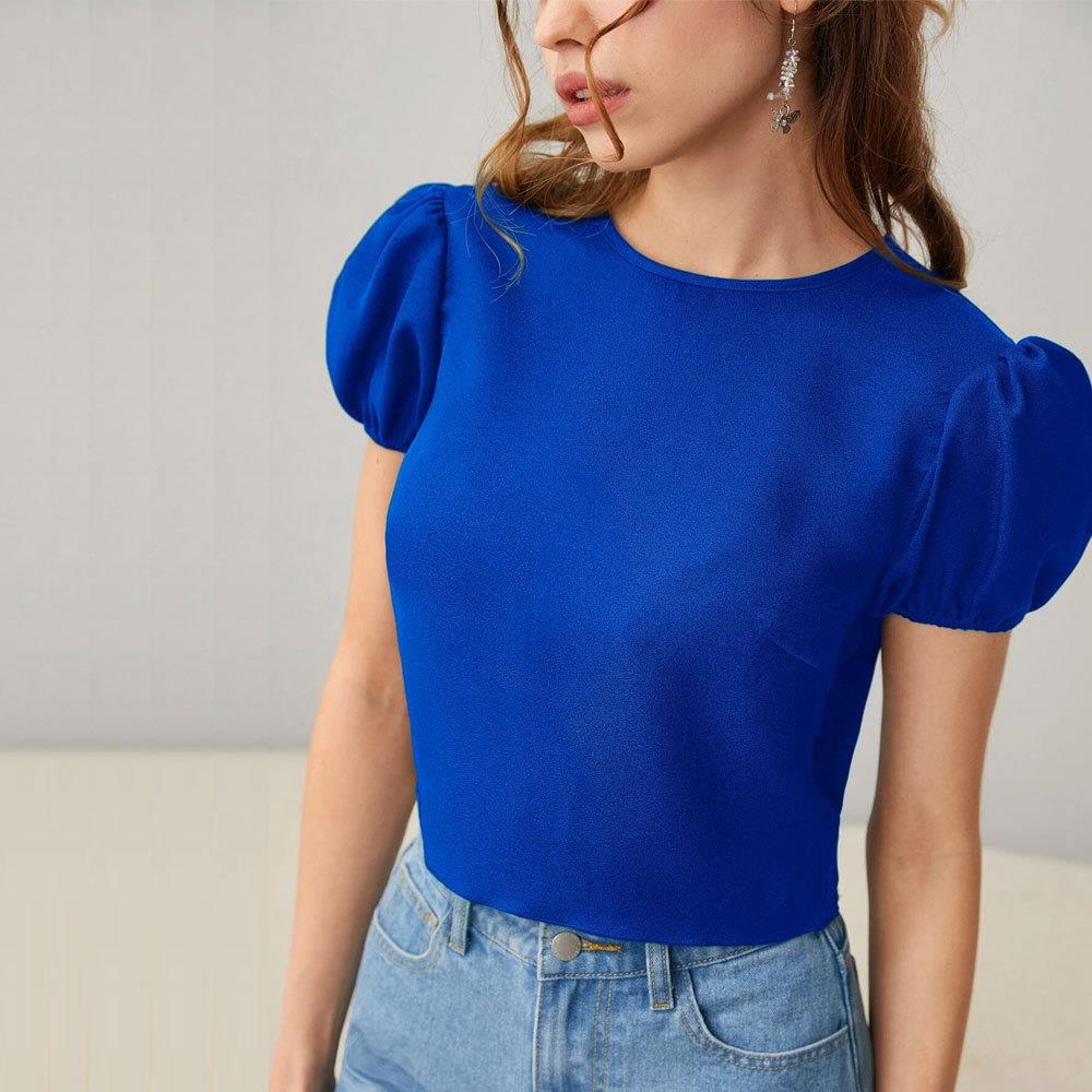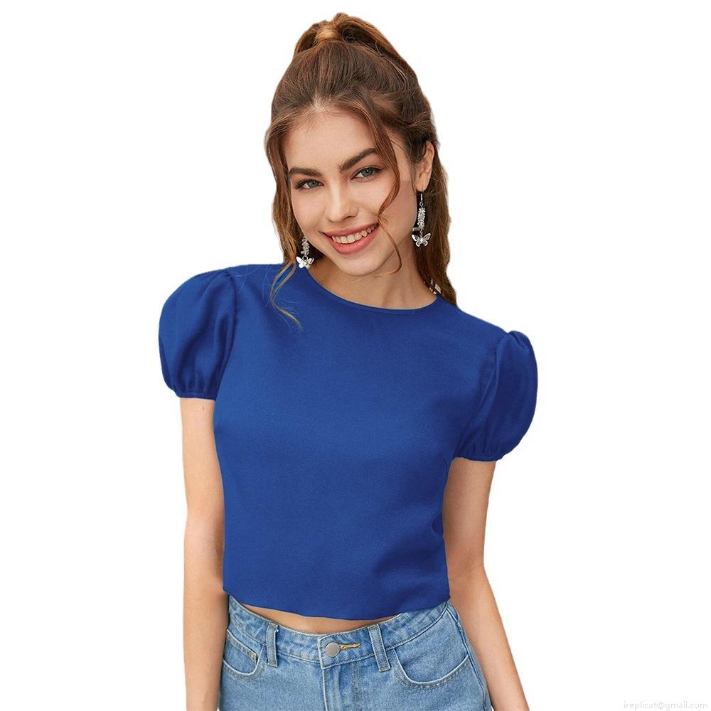 • Women French Style Puff Sleeve Crop Top 100% Polyester Backless Tie Back Round Neck Short Sleeve T-Shirt For Casual Party Fashion Summer Blouse