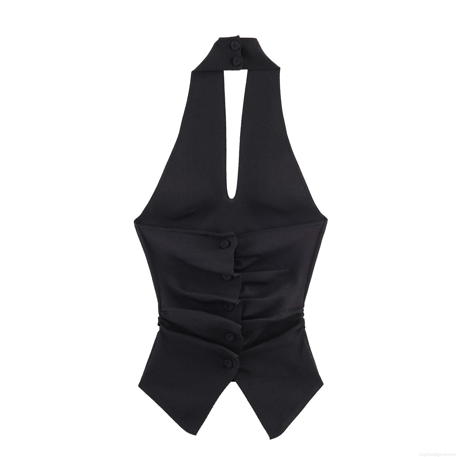 • Women Halter Neck Knit T-Shirt Sleeveless V-Neck Ruched Single Breasted Irregular Hem Sexy Summer Streetwear Fashion Ribbed Slim Fit Camisole Top