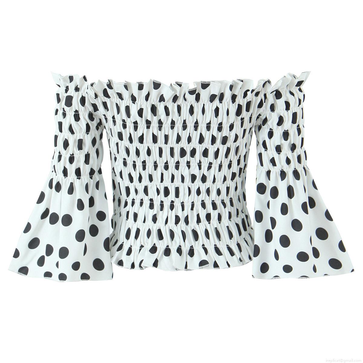 • Women Off-Shoulder Polka Dot T-Shirt Polyester Cotton Blend Smocked Body Bell Sleeve Ruffle Crop Top Street Style Slim Fit Top for Summer Casual