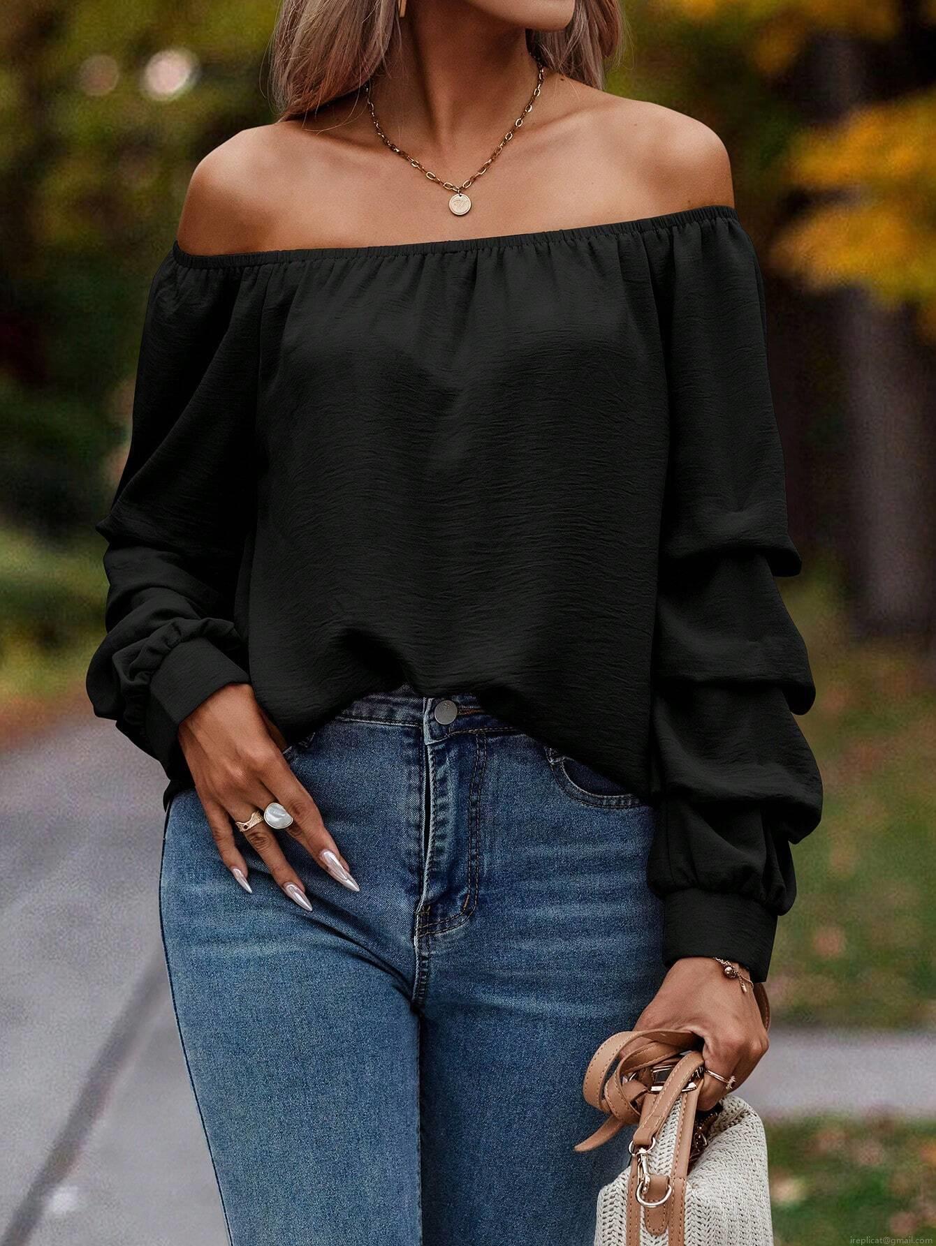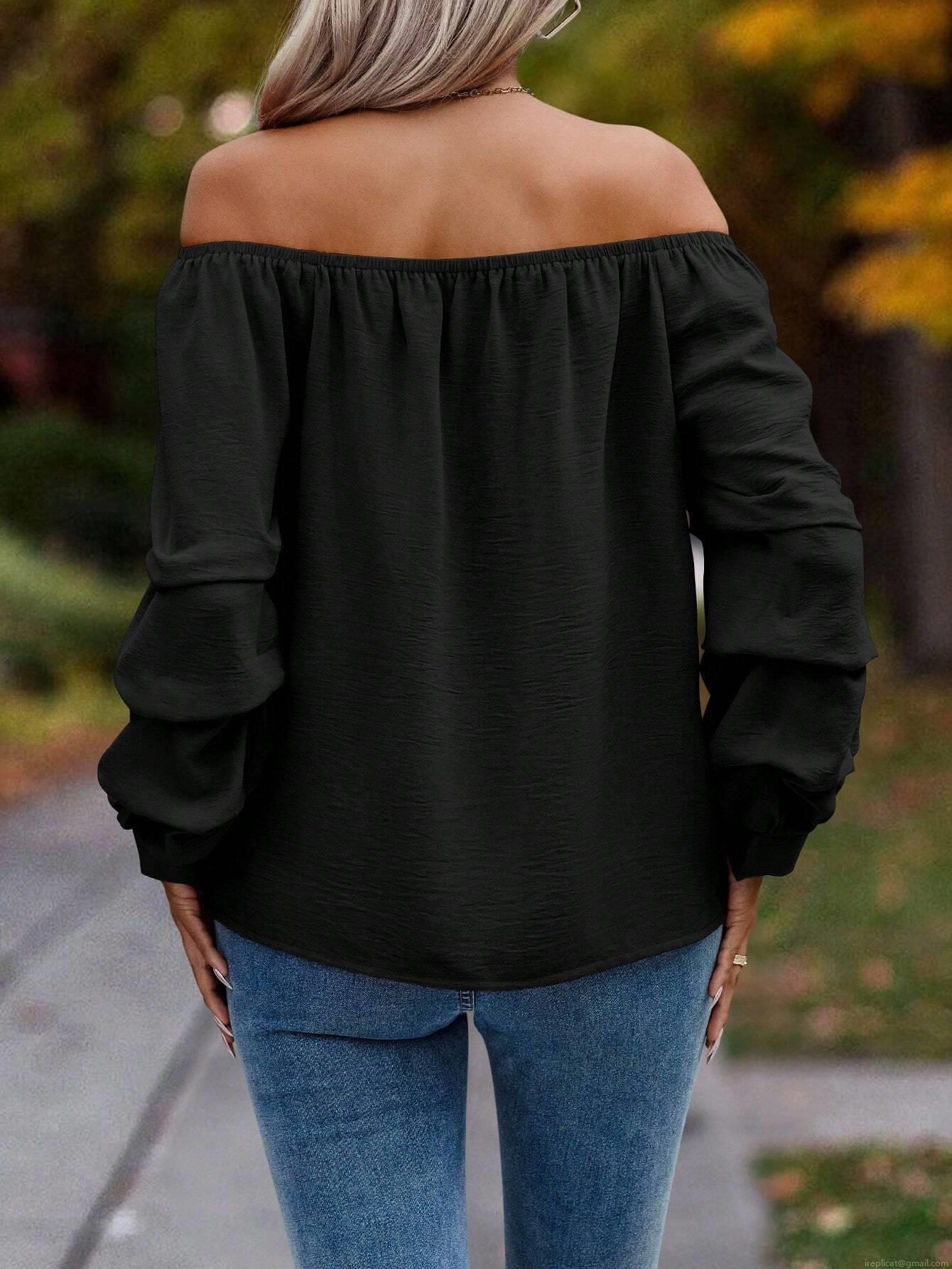 • Women Off-the-Shoulder Long Sleeve T-Shirt Elegant Smocked Textured Pullover Top For Party Office Solid Color Polyester Blend Slim Fit Blouse Casual Style