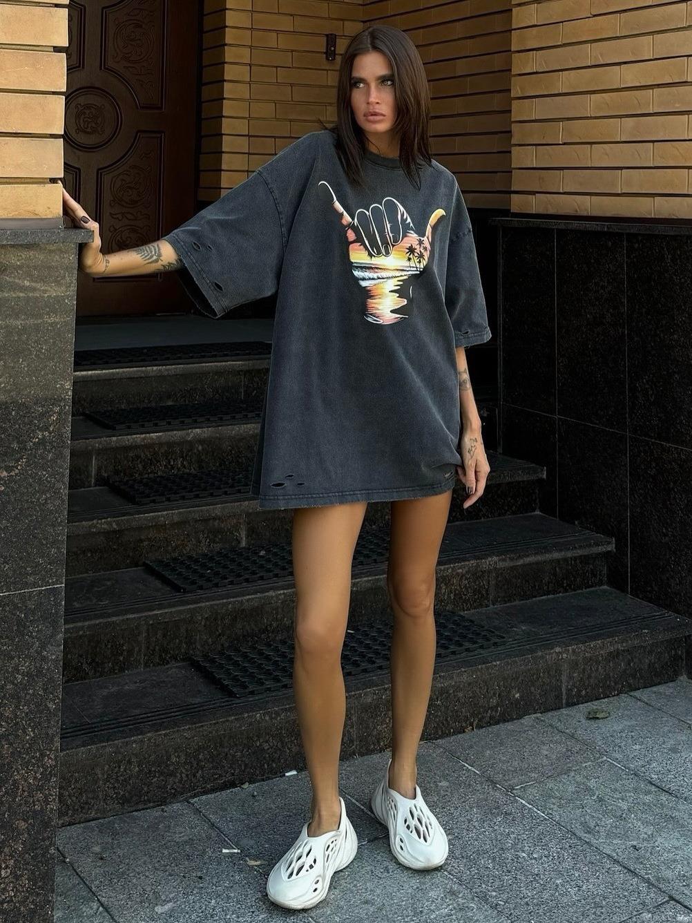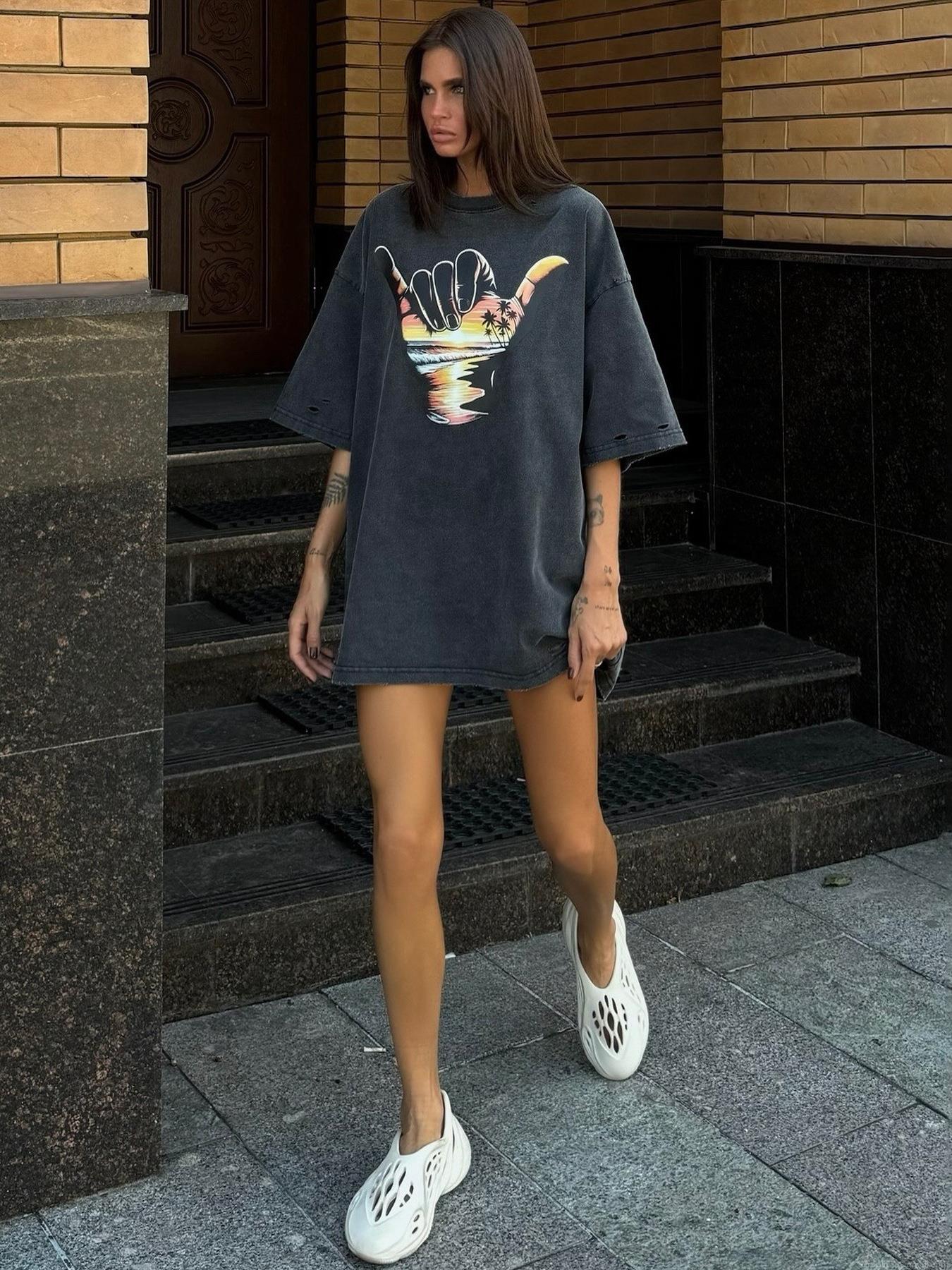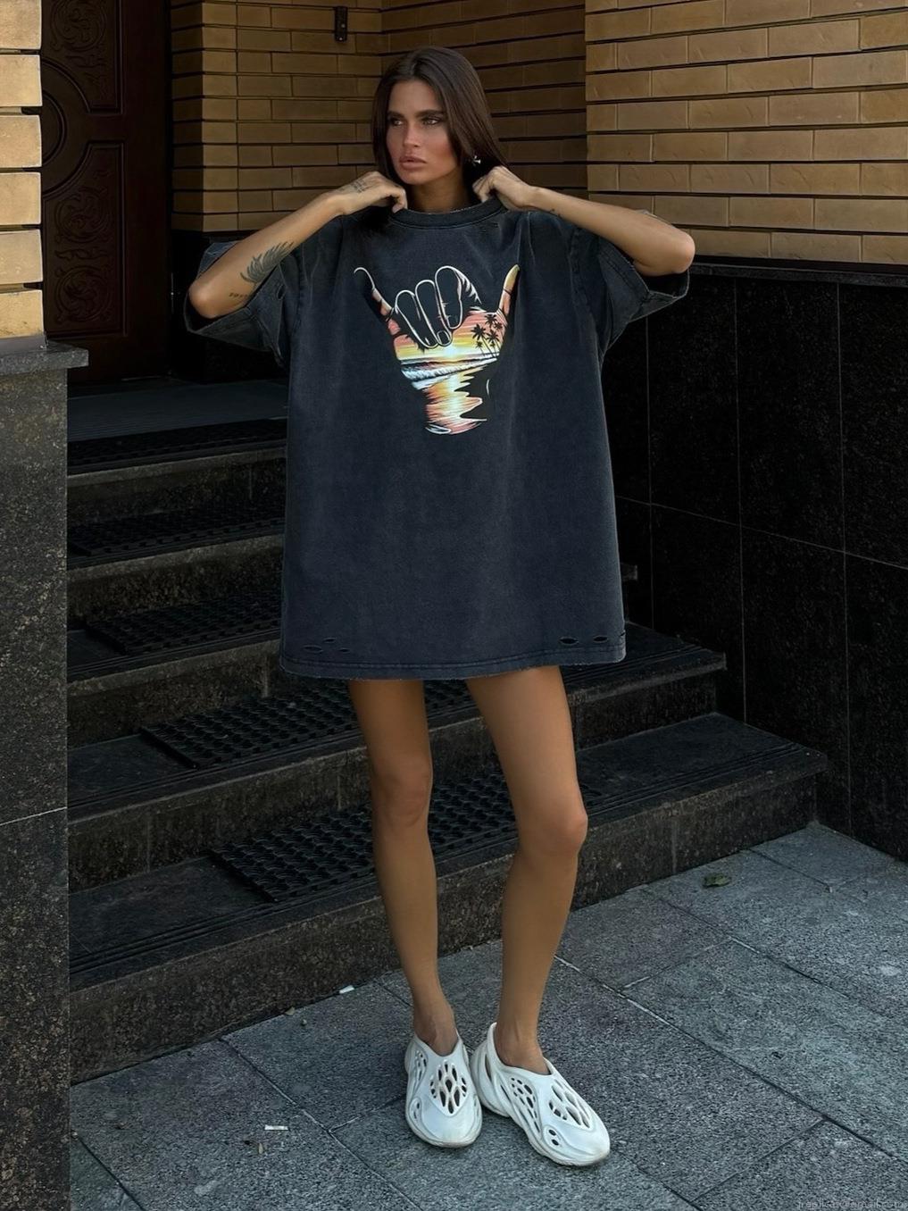 • Women Oversized Distressed Cotton T-Shirt Vintage Washed Shaka Hand Sign Sunset Print Short Sleeve Streetwear Tee Top For Summer Daily