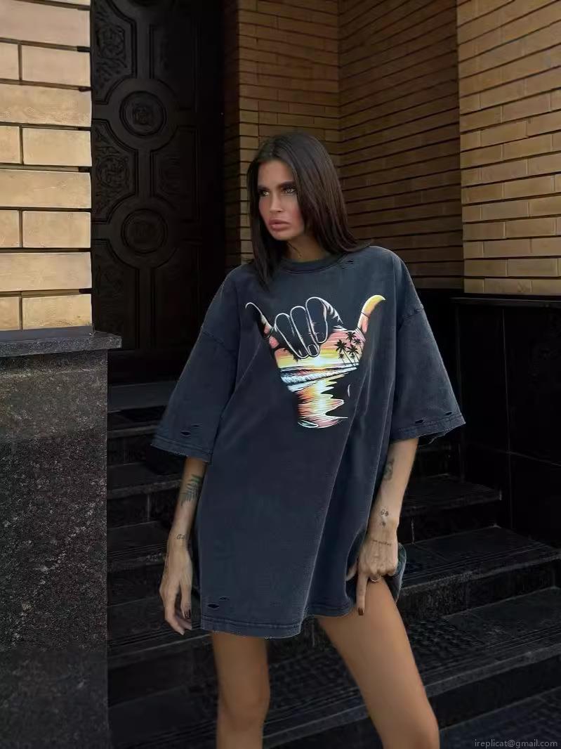Women Oversized Distressed Cotton T-Shirt Vintage Washed Shaka Hand Sign Sunset Print Short Sleeve Streetwear Tee Top For Summer Daily