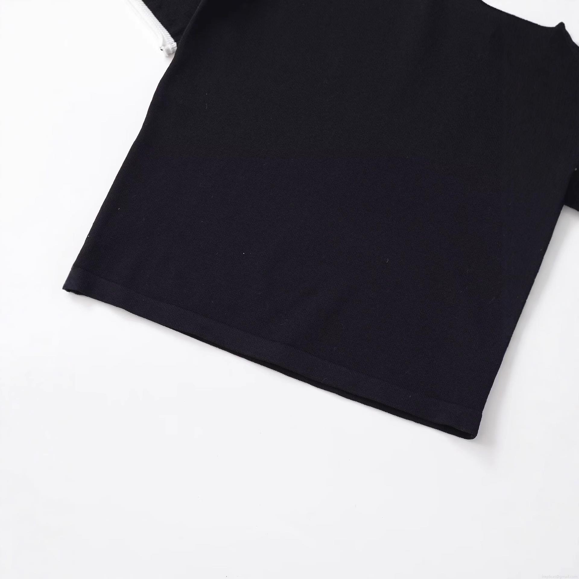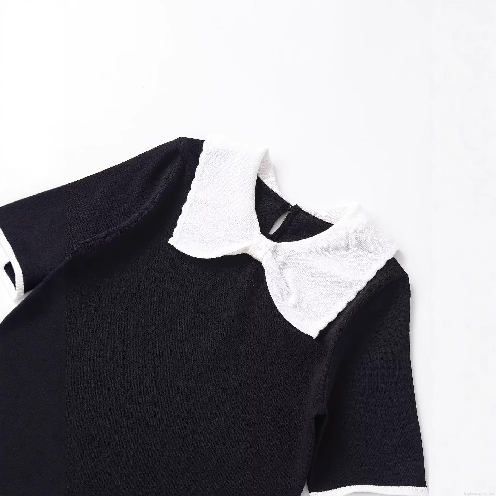• Women Peter Pan Collar Short Sleeve Knit T-Shirt Sweet Bow Tie Contrast Color Black White Patchwork Top For Summer Casual Daily Retro Preppy Style