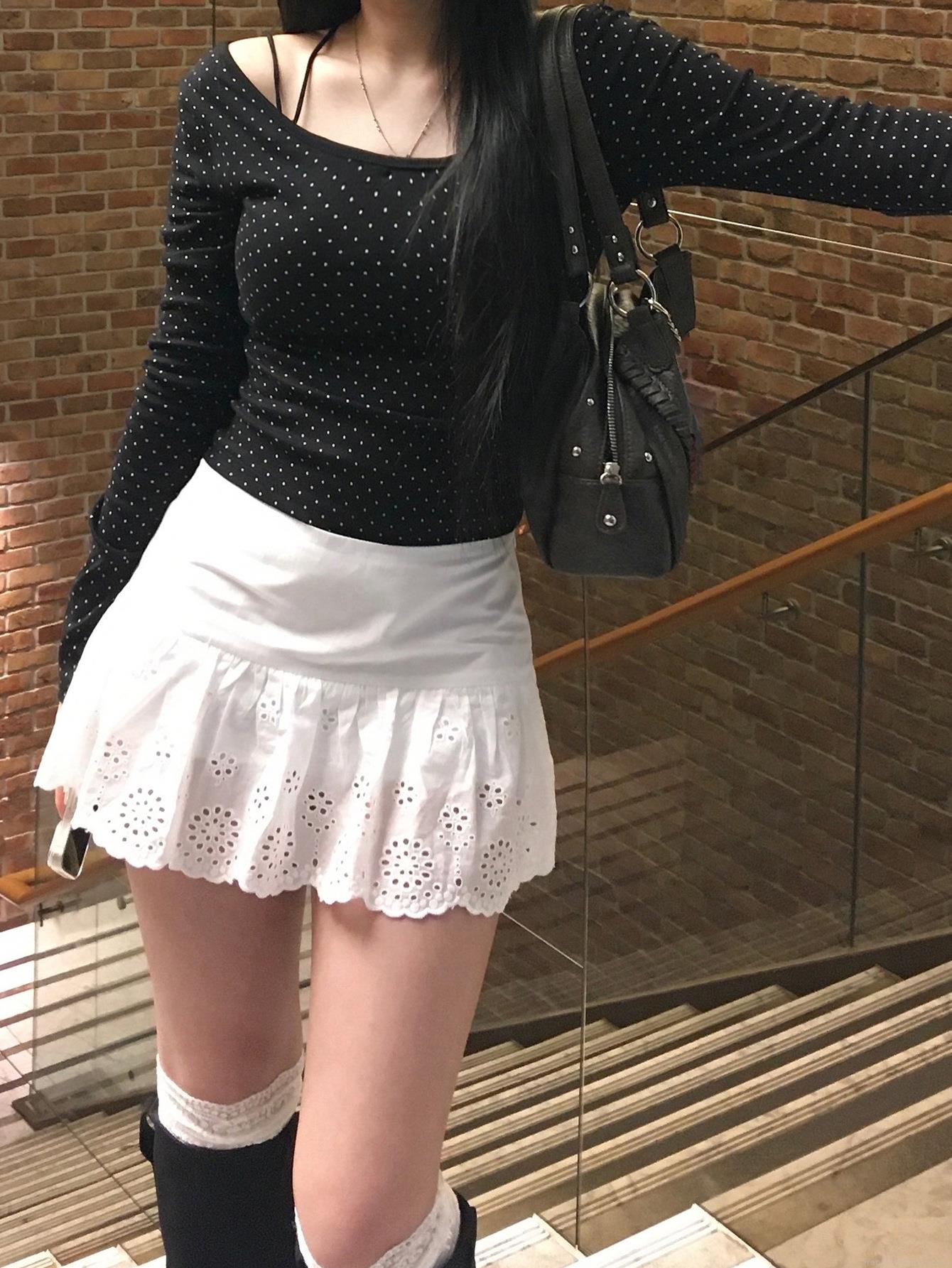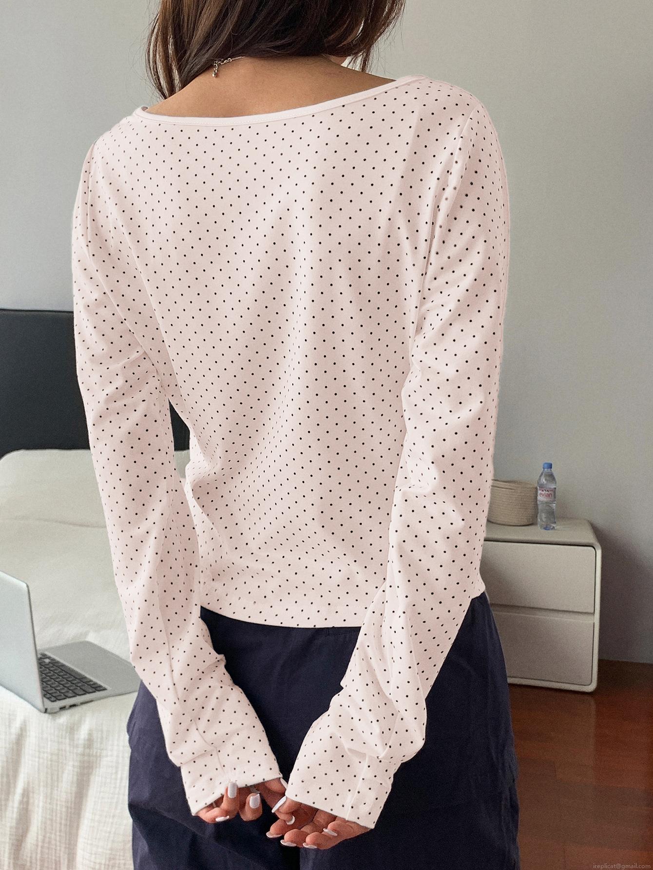 • Women Polka Dot Long Sleeve T-Shirt Round Neck Polyester Elastane Blend Ribbed Knit Slim Fit Casual Daily Travel Vacation Tops
