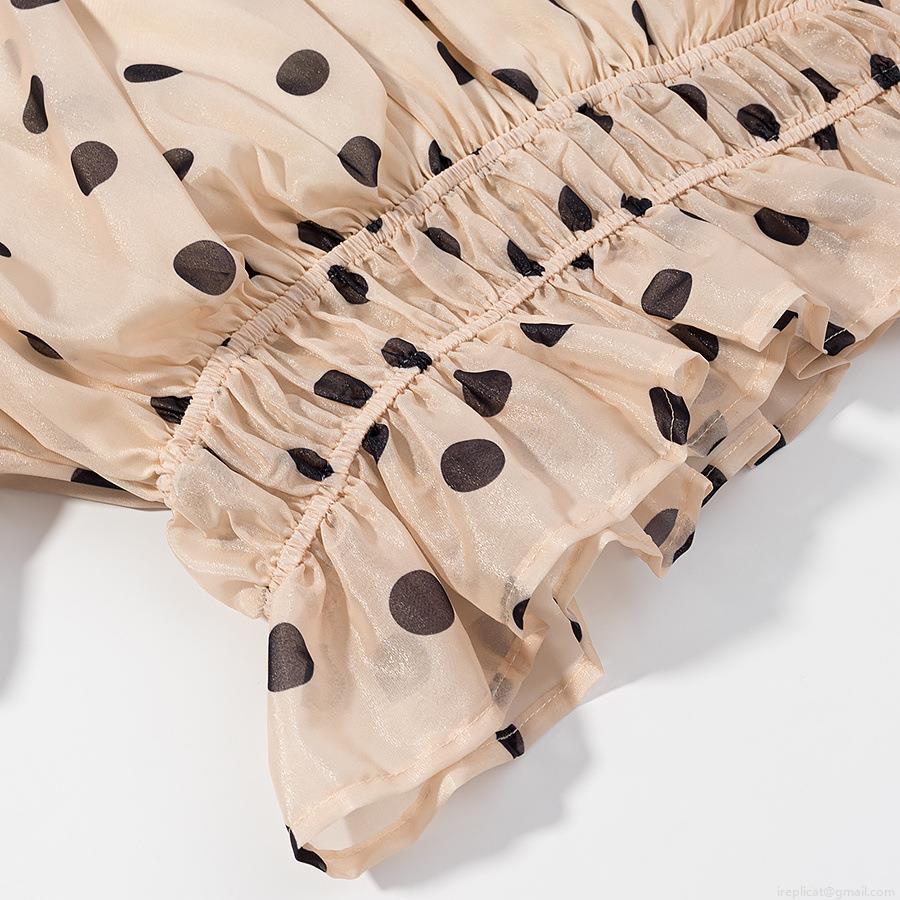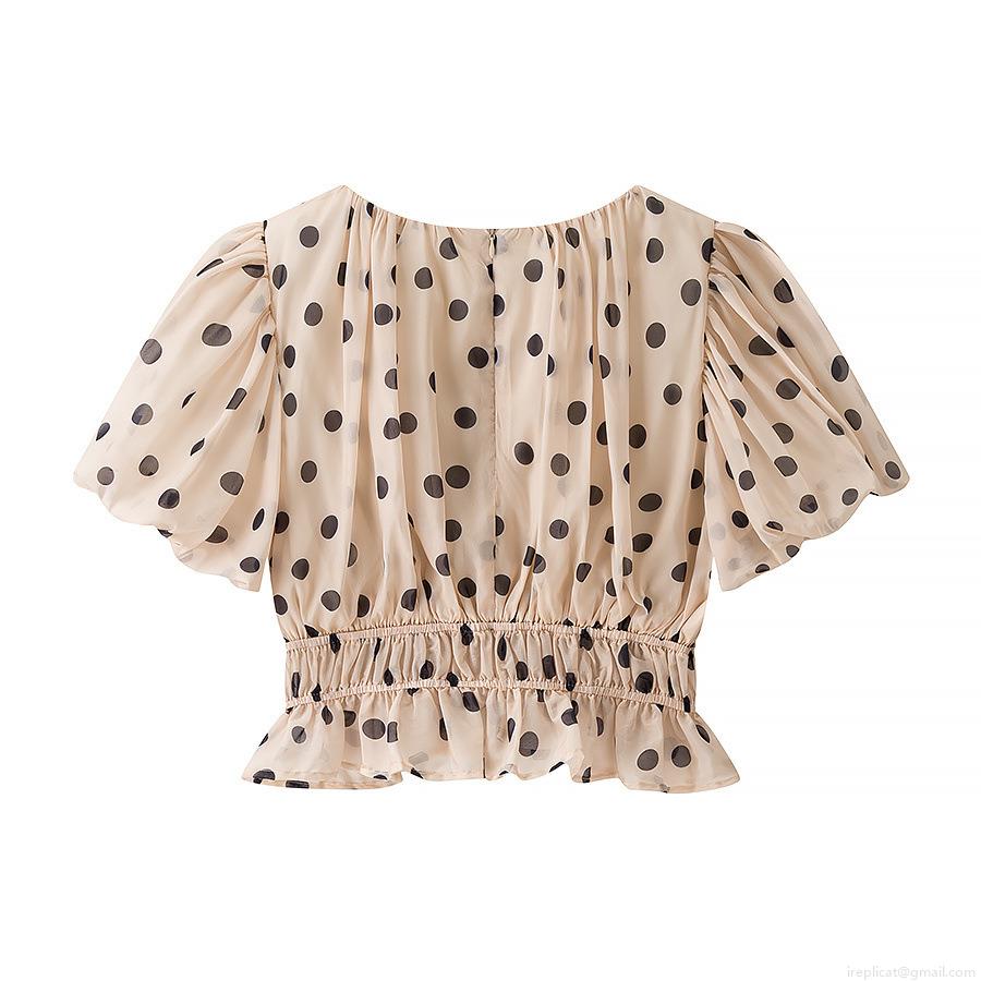 • Women Polka Dot Puff Sleeve Chiffon T-Shirt Elegant Ruffle Hem Slim Fit Cinched Waist Pullover Top For Summer Dating Casual Sweet Style Beige