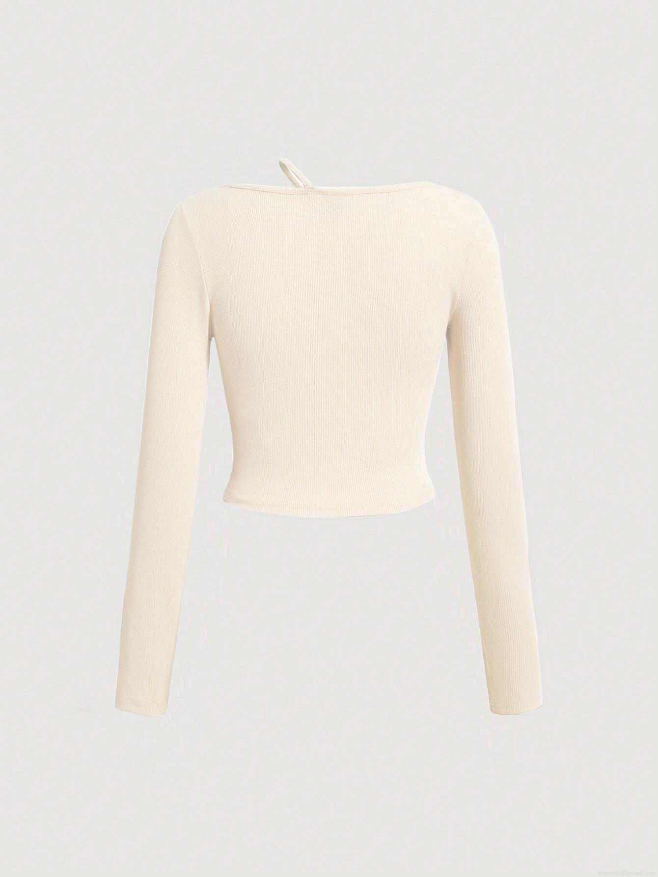 • Women Ribbed Knit T-Shirt Asymmetric Neckline Long Sleeve Slim Fit Crop Top Solid Color Viscose Blend Elegant Casual Office Wear Top