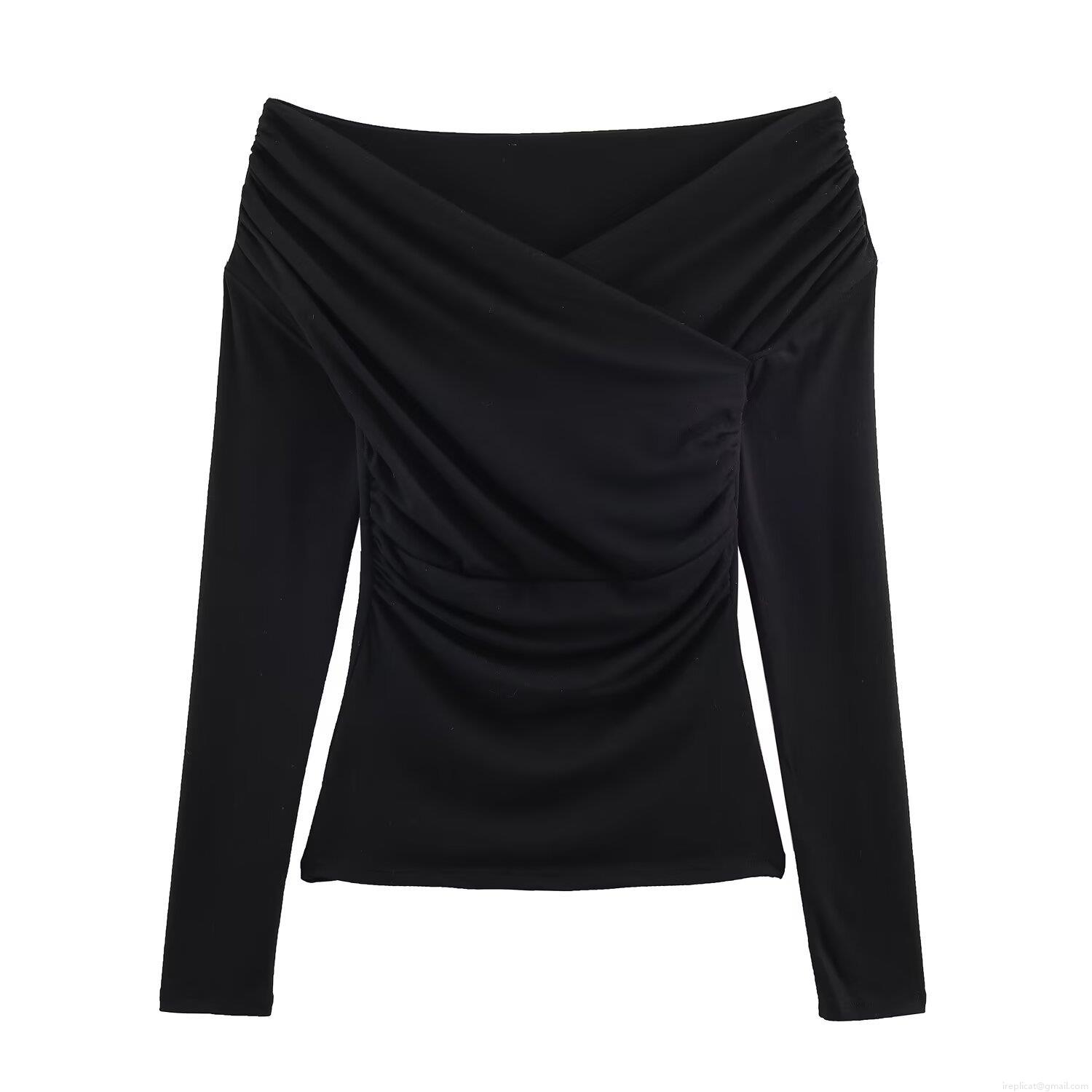 • Women Ruched Wrap V-Neck Off Shoulder Long Sleeve Top Slim Fit Polyester Solid Color Elegant Pleated Streetwear Casual Basic Tee Shirt