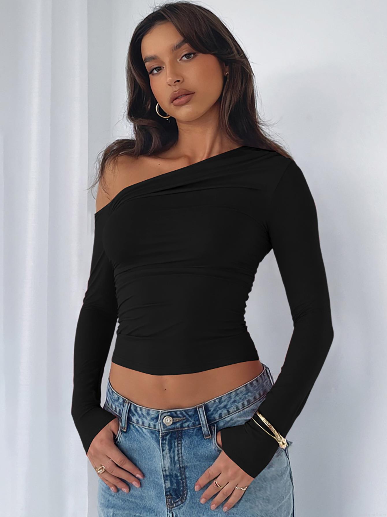 • Women Sexy Asymmetrical One Shoulder Crop Top Long Sleeve Ruched Polyester Spandex T-Shirt Streetwear Solid Color Slim Fit Fashion Top